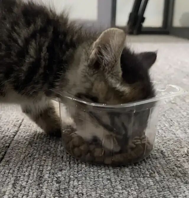 现在奶糖已经会自己吃猫粮了~~碗是奶茶下面的托剪下来的😂😂,奶糖的头比碗还小,整个脸埋进去吃hhhh![]()