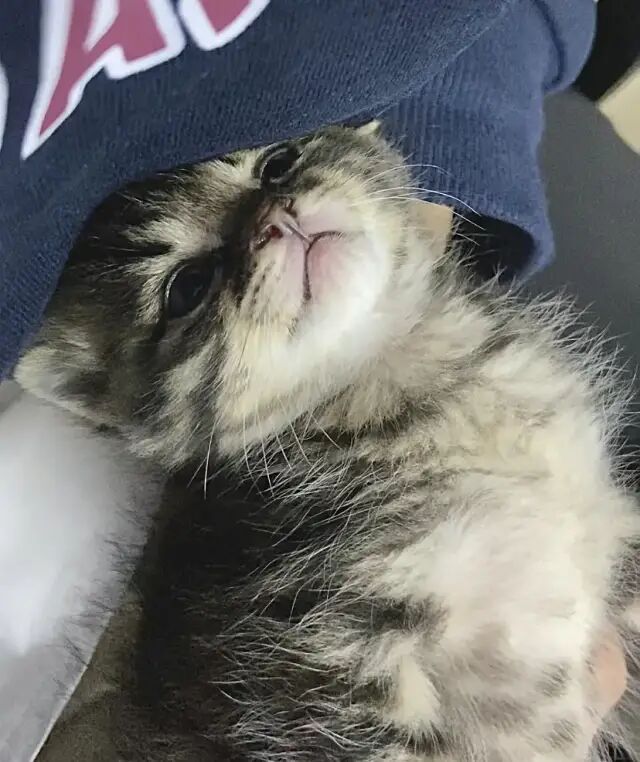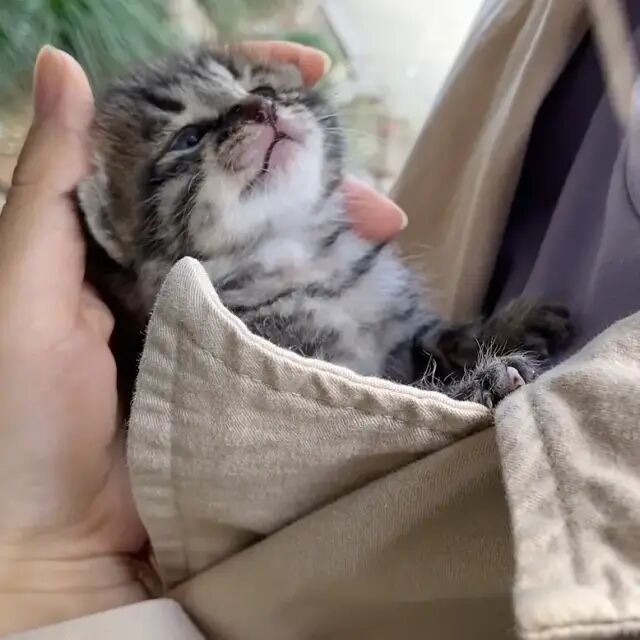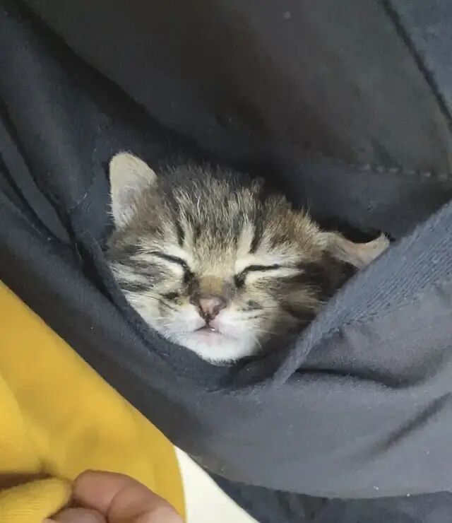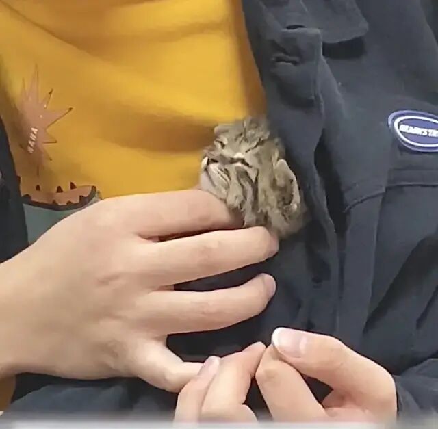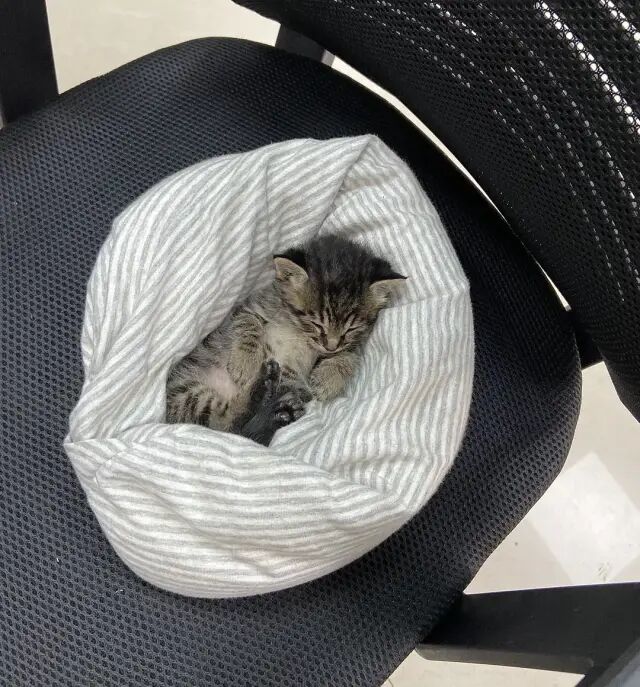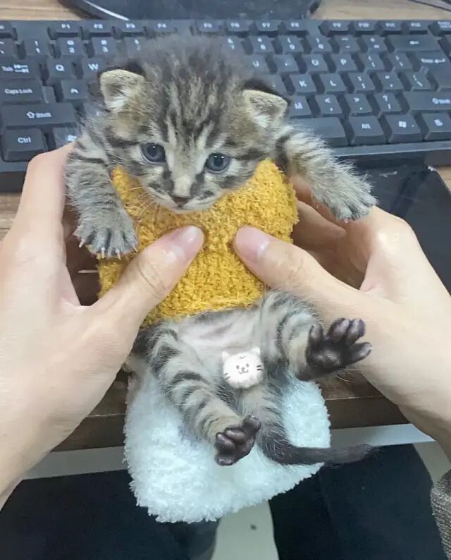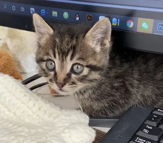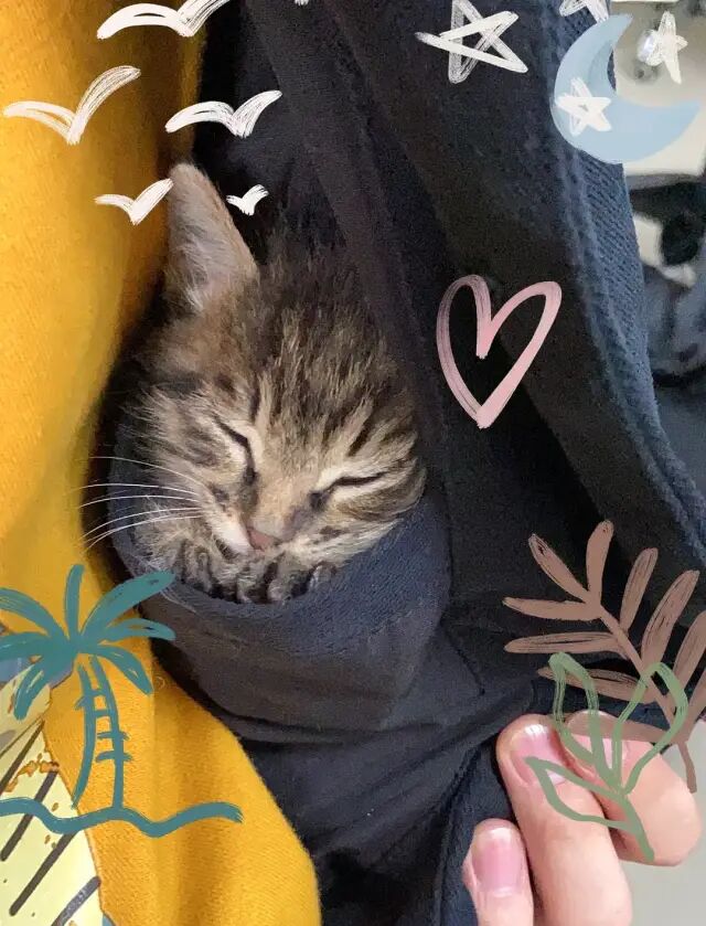 由于小猫实在太小了,白天需要人照顾,同事只好装进袋子里偷偷带来公司