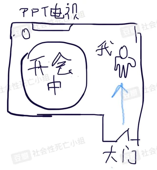 会议室的平面图...你们可以想象我用屁股走了一段路,转头才发现旁边的一群人... 而且他们在放PPT没开灯...我以为房间里只有我那同事,没别人🤦🏻♀️![]()