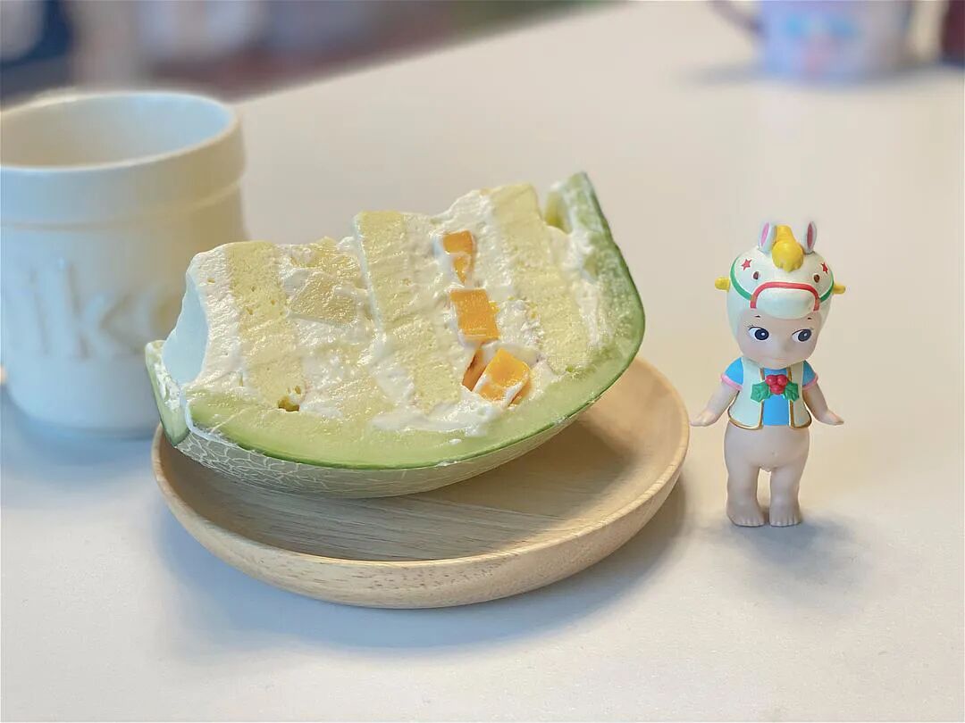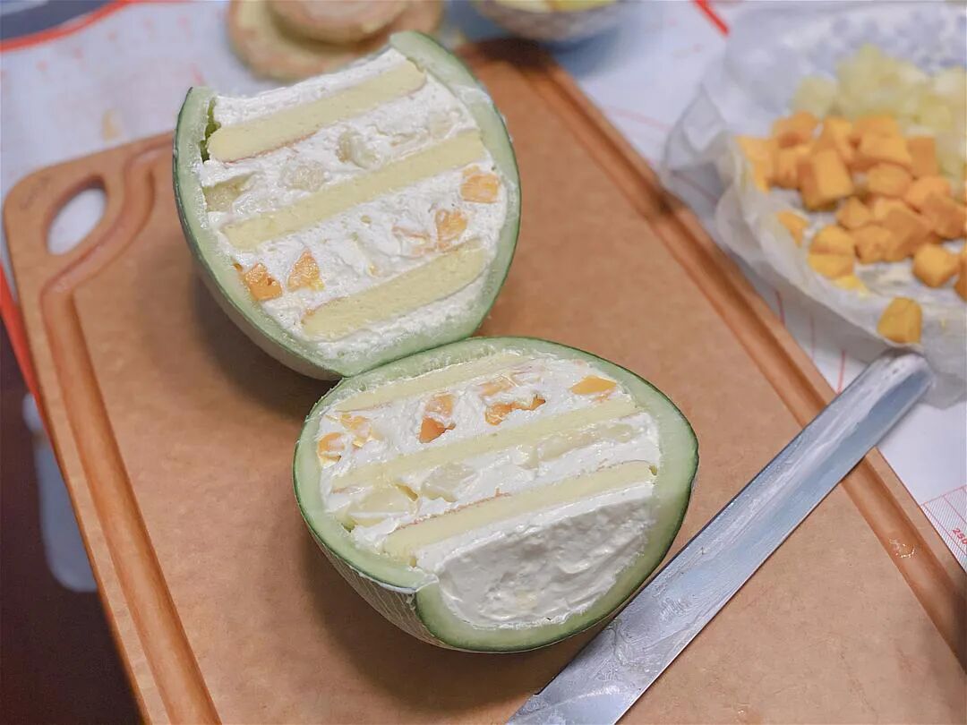 我试做了整个蜜瓜蛋糕! 如果会做戚风或者瑞士卷儿 就很简单 我用瑞士卷的方形烤盘 然后用家里的杯杯碗碗扣出了好几个圆圈⭕️ 还多了很多 老板给我的玫珑蜜瓜太烂了,他说这样的才好吃 所以球不太好挖 但是真的很甜!蛋糕胚和奶油的糖度都可以减半,我之前一直担心蜜瓜水太多会把蛋糕胚给浸湿,用厨房纸吸了很多次水,用奶油做隔断以后 放保鲜里面第二天蛋糕也不会湿! 来自豆瓣小组“下厨房”