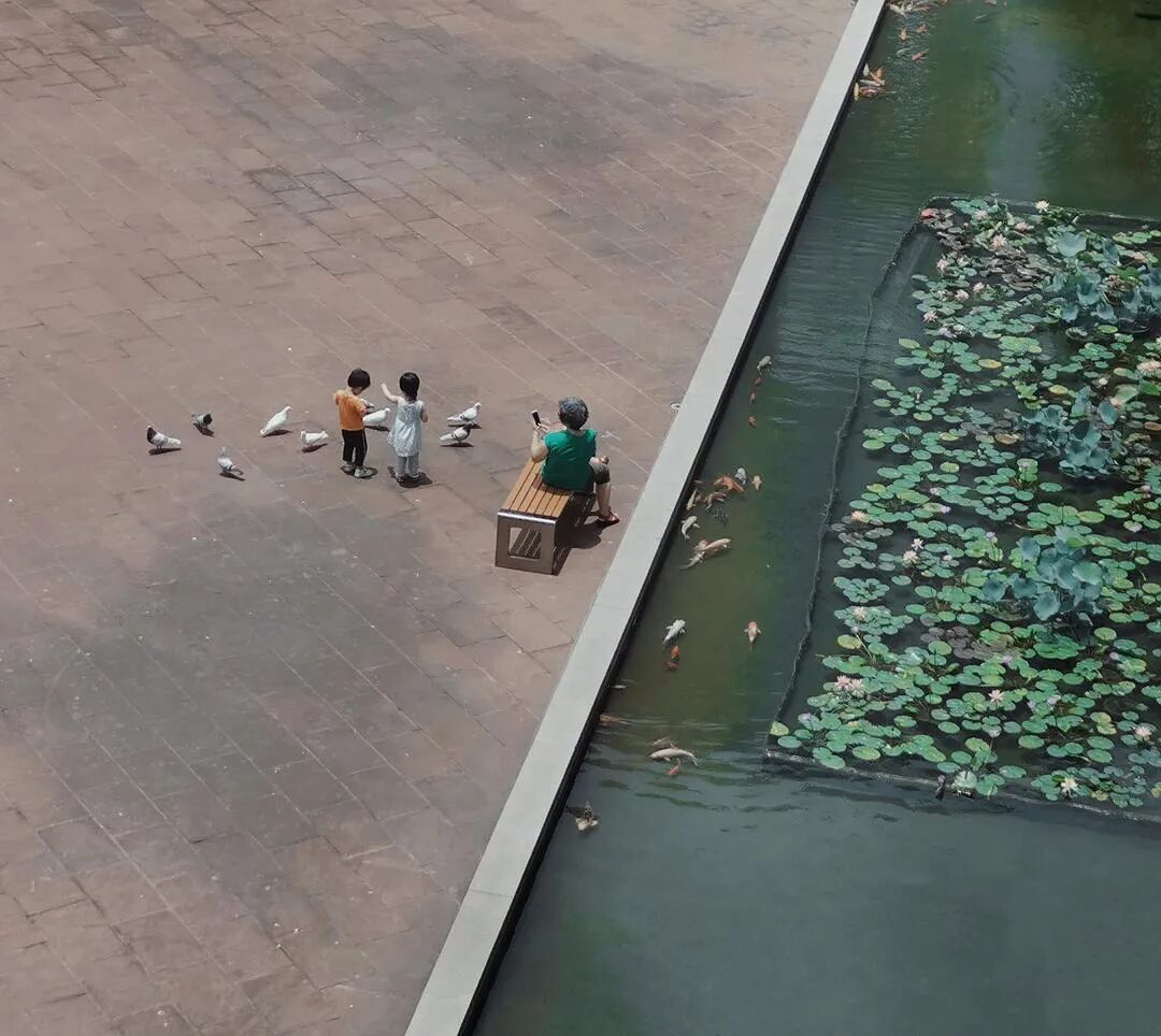 从美术馆楼梯窗户往下看,池塘把画面分成两半。两个小朋友在喂鸽子,奶奶在拍他们,我在拍她拍他们。 来自豆瓣小组“无用美学”