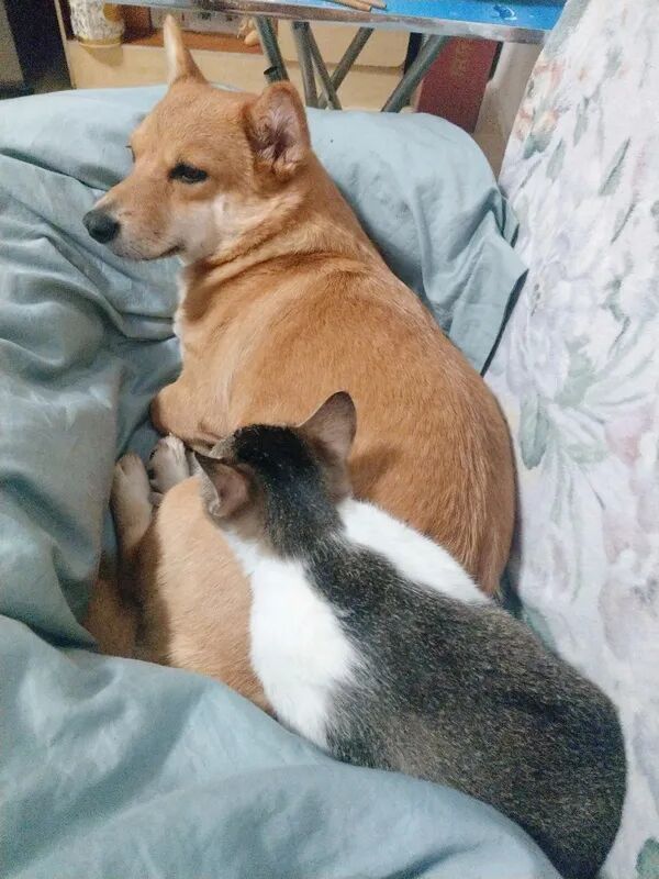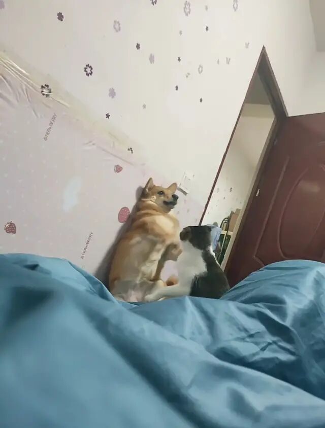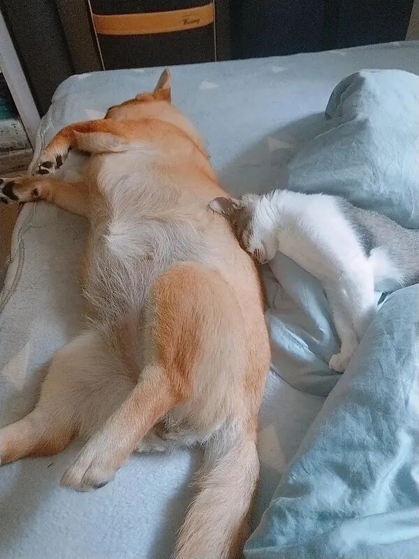 刚开始真的很暖,狗子特别宠猫,猫也很依赖狗子