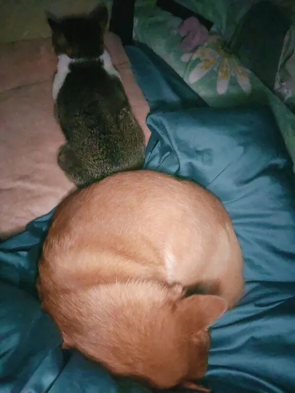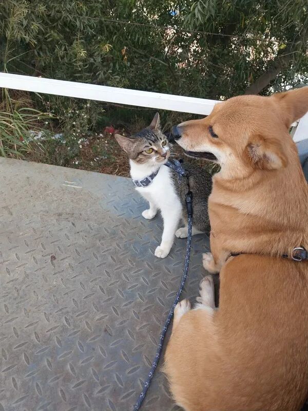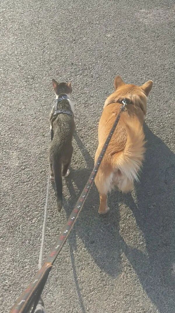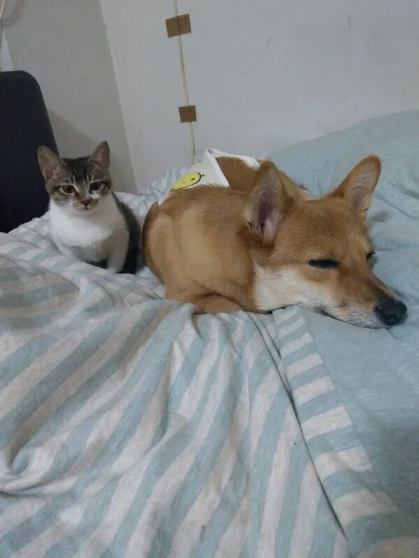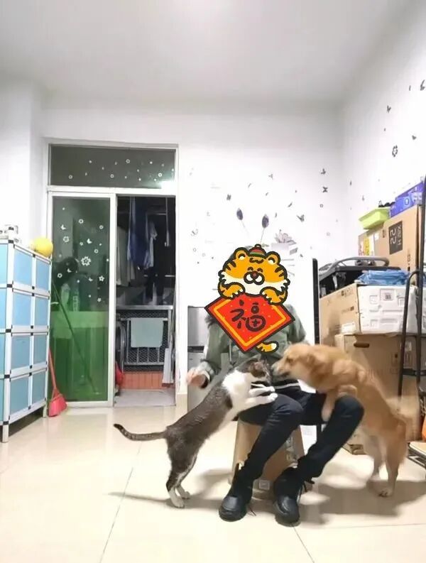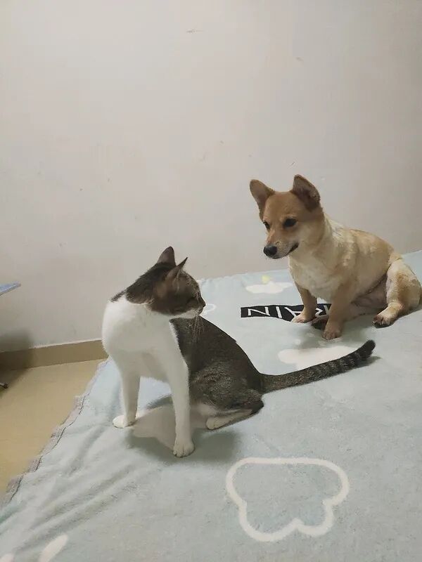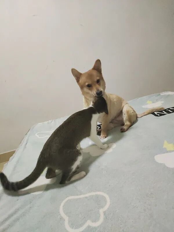 但猫猫其实很瘦弱,刚捡回来时虚弱得就剩一层皮,差点以为养不活。至于狗子,它是被我们教育得这么怂的,真打架体重都压制了,出去玩跑快了经常停不下来脸刹车,还经常撞倒我,甚至有一次围着一个亭子跑圈太激动,跑了几圈后直接把我撞飞了(真的不夸张,它撞我小腿,我整个人飞出去趴地上了)