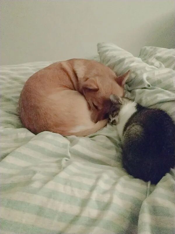 我家猫猫超级乖的,狗子就是过分热情了,它俩也不动真格。话说猫还是狗捡回来的,它们以前感情也很好的,猫小时候也没这么烦狗。