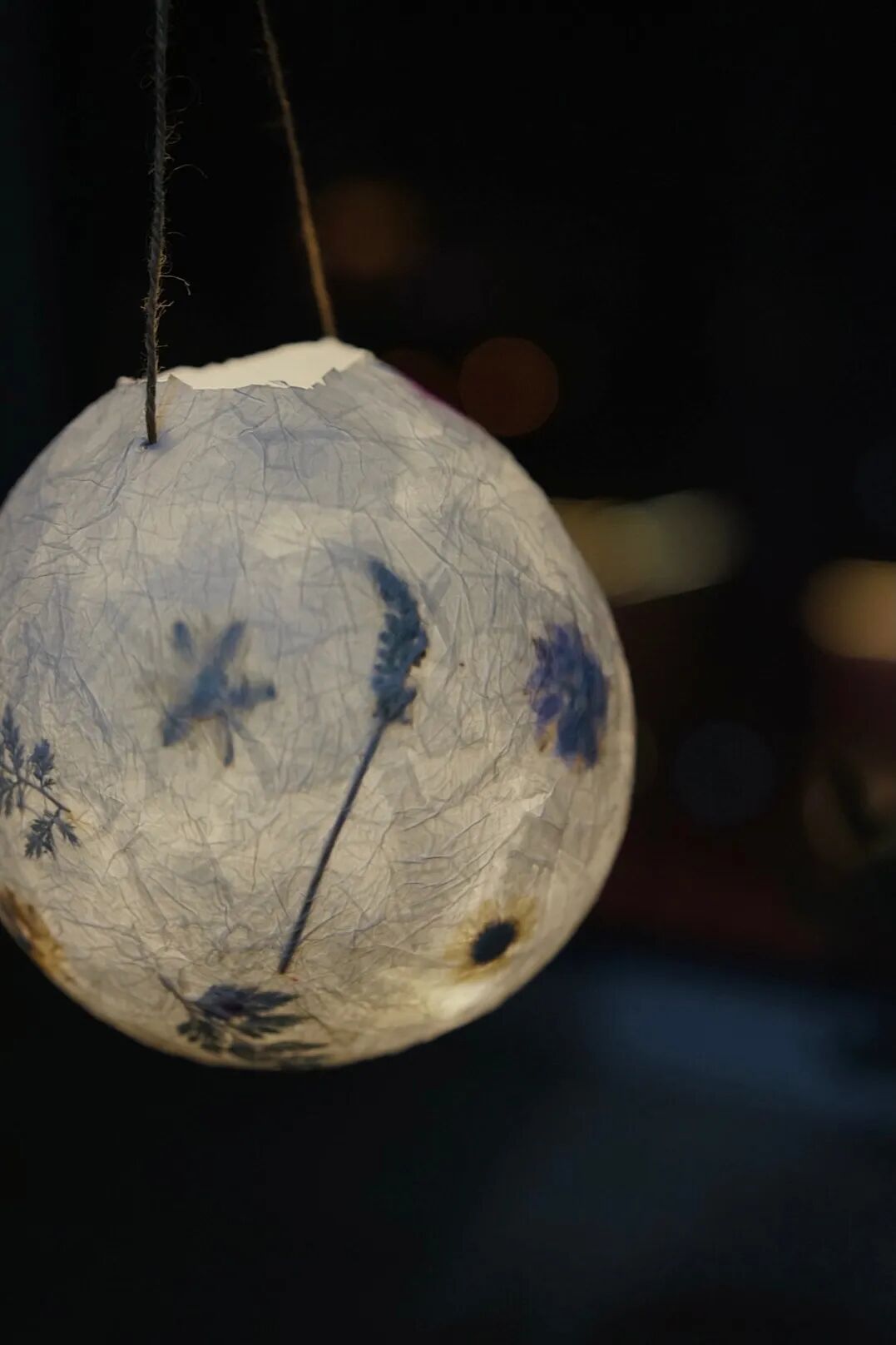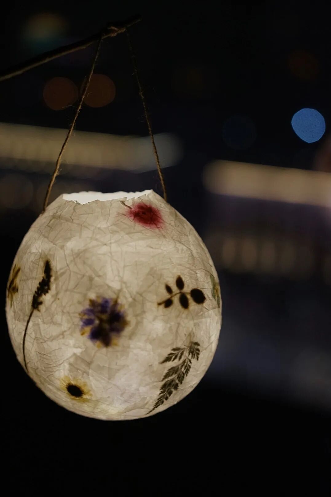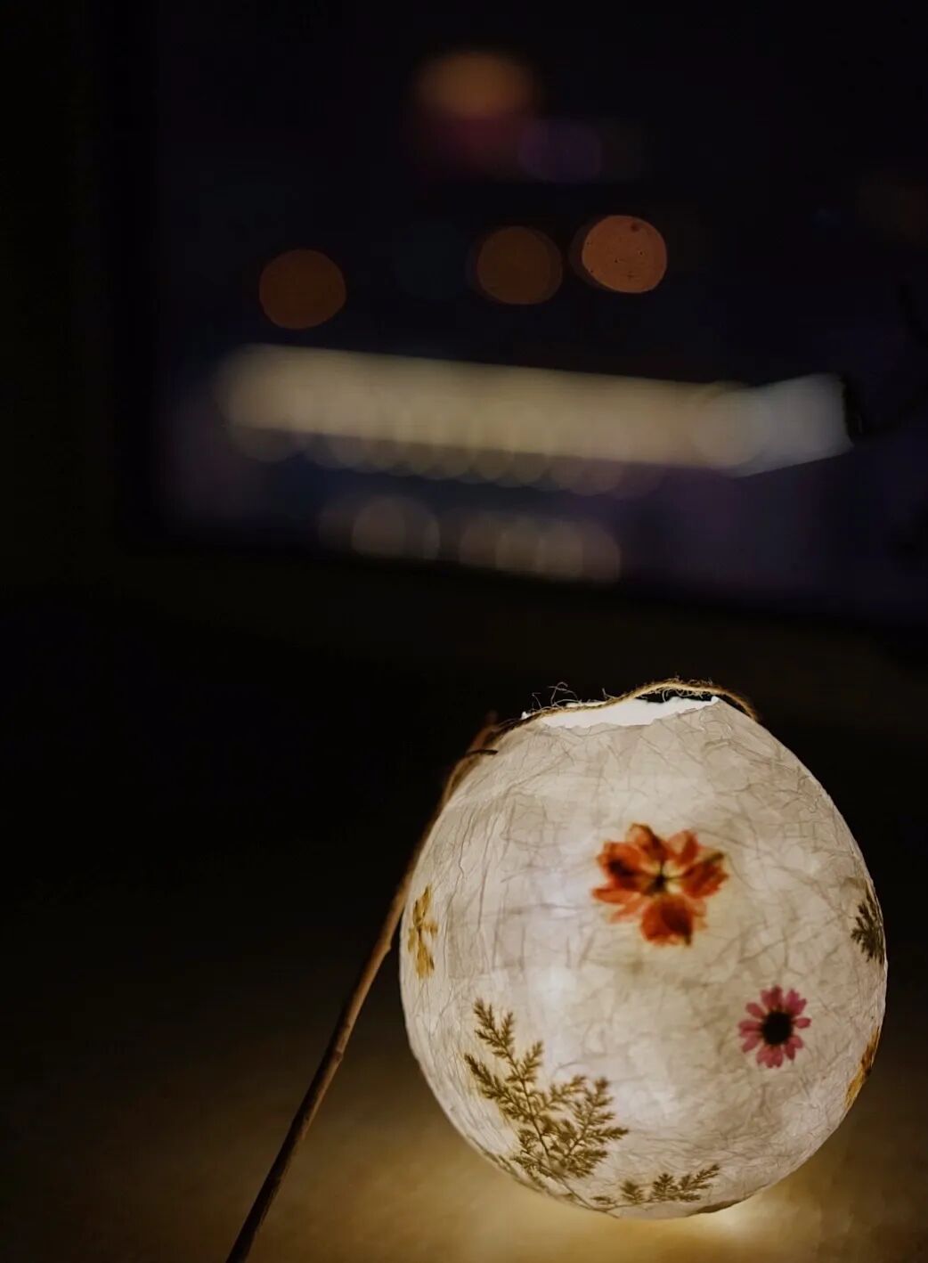 闲来无事,用干花做了一个纸灯笼,花花草草真是太美了,灯光治愈人心。 准备气球,抽纸,干花,白乳胶,笔刷,led灯串,麻绳。 1. 气球吹成自己想要的灯笼大小,将抽纸撕成薄片状用笔刷蘸清水粘在气球表面(要将气球除了打结处都粘满) 2. 将白乳胶和清水1:1调和,用这个混合物将干花贴在气球表面,再在干花上面粘上一层纸巾。 3. 再整体用纸巾把气球再粘一遍。 4. 晾晒12-15个小时,晾干后就可以把气球扎破并取出了,修剪一下灯笼开口处,再放入led灯串,边缘穿洞系上麻绳就可以啦!也可以像我一样捡个树枝什么的作为手柄。 来自豆瓣小组“无用美学”