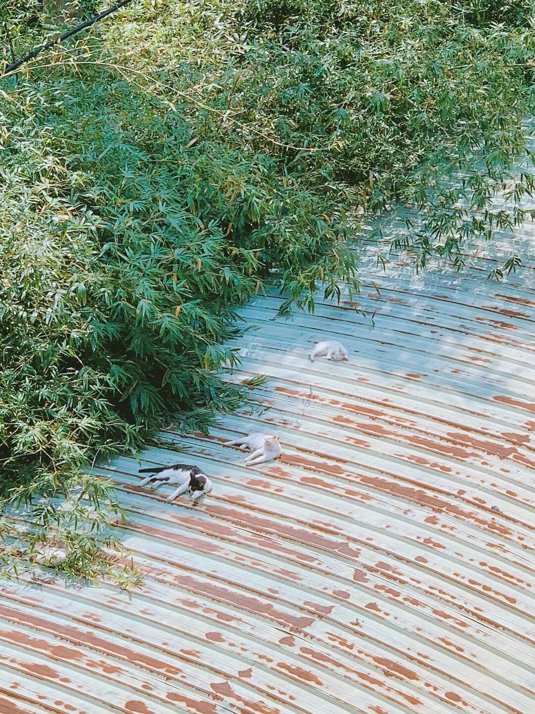 五只咪排成半月形🌙在车棚顶日光浴 来自豆瓣话题#猫咪迷惑行为全记录#