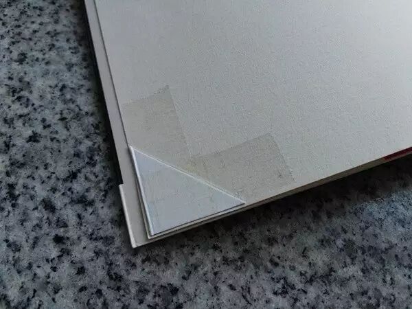 7. 边角做硬处理。为了让书保持四角永远的平整,透明胶派不上用场,除非是软皮书。这时需要用纸板剪成三角,贴在书皮的后面。纸板的薄厚要仔细斟酌,不同的封面要用不同质地的垫板。当然贴好之后,还是要用透明胶封好。透明胶太重要了。