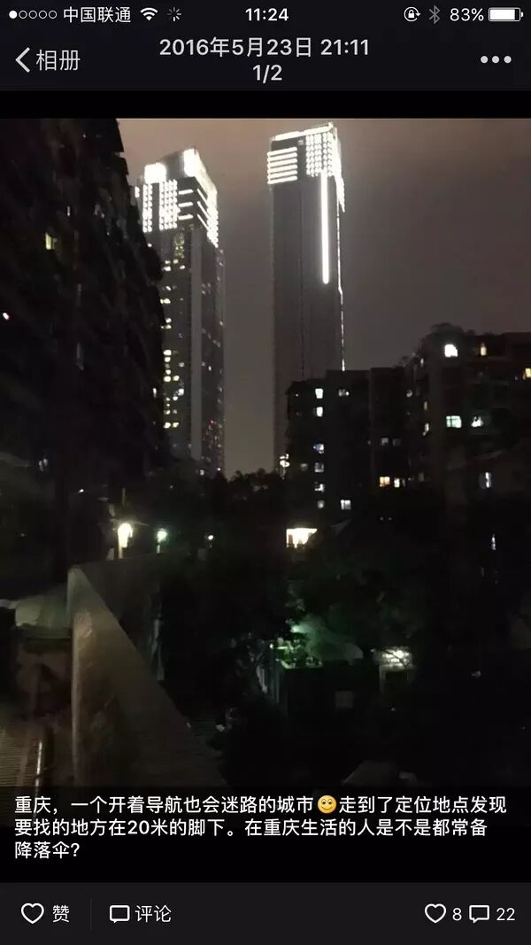 更要命的是在我高高低低七转八拐爬了许多坡和楼梯之后,我发现定位的位置在我20米的脚下,而我当时完全看不到下去的路。我当时整个人是懵逼的。于是我发了个朋友圈: