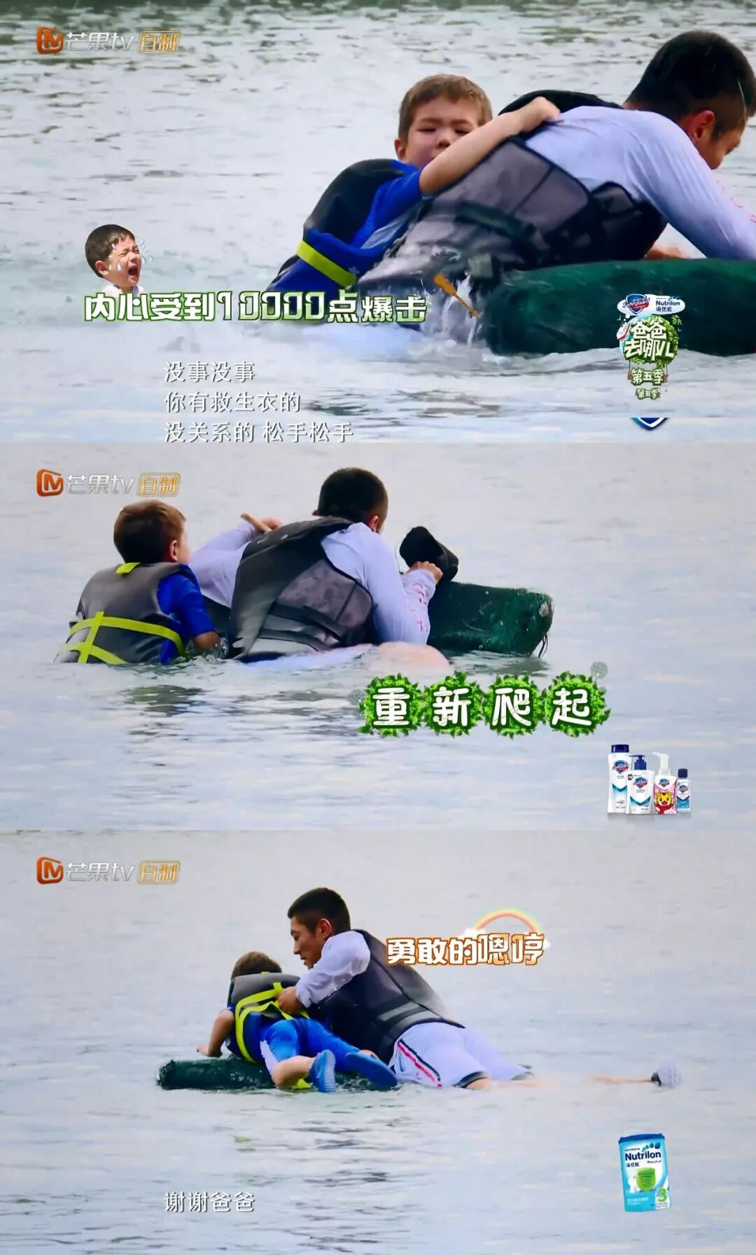 钢铁直男嗯哼还是一个非常勇敢的Boy。杜江的小木筏翻进水里,嗯哼虽然一开始惊慌失措,但是听完爸爸的安慰,真的就在水里松手了。