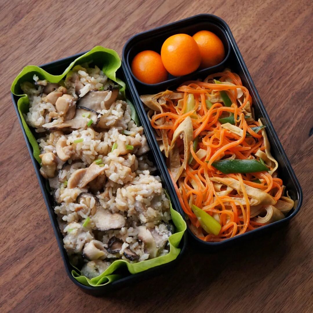 2. 香菇芋头鸡腿肉饭+豆筋炒胡萝卜丝+金橘