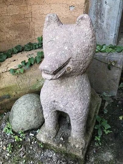 我婆婆家那边的一只石狮子,收稻子的季节有人晒了稻子顺手把耙子放它边上。