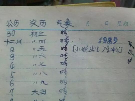 某次回家翻到的爸爸的笔记本,我出生那天的记录。
