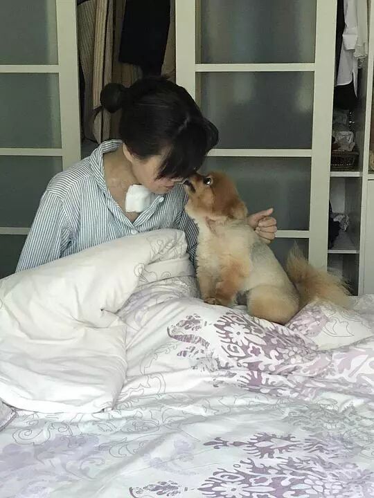 妈妈做完手术从医院回家静养,很久没见到主人的狗狗立刻冲上去给了妈妈一个吻。