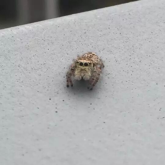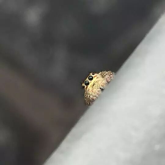 一次在阳台的栏杆上发现一只米粒般大的小跳蛛。它发现我在看它,一会跟我注视着看,一会围绕着扶手栏杆跑来跑去,像是在躲我又像是在跟我玩捉迷藏,我就一直跟拍…