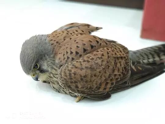 同事在单位院子里捡到的一只小隼,因为太小了都站不稳,我们一个办公室的人围着它看了整整一下午,直到园林局来人把它接走了。