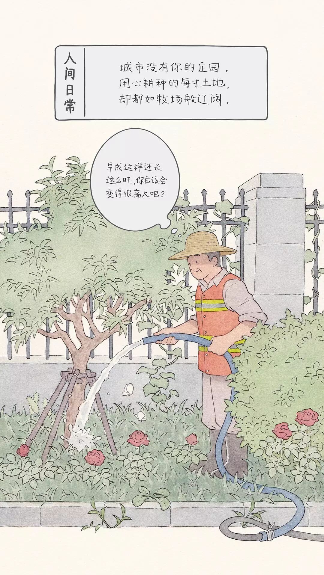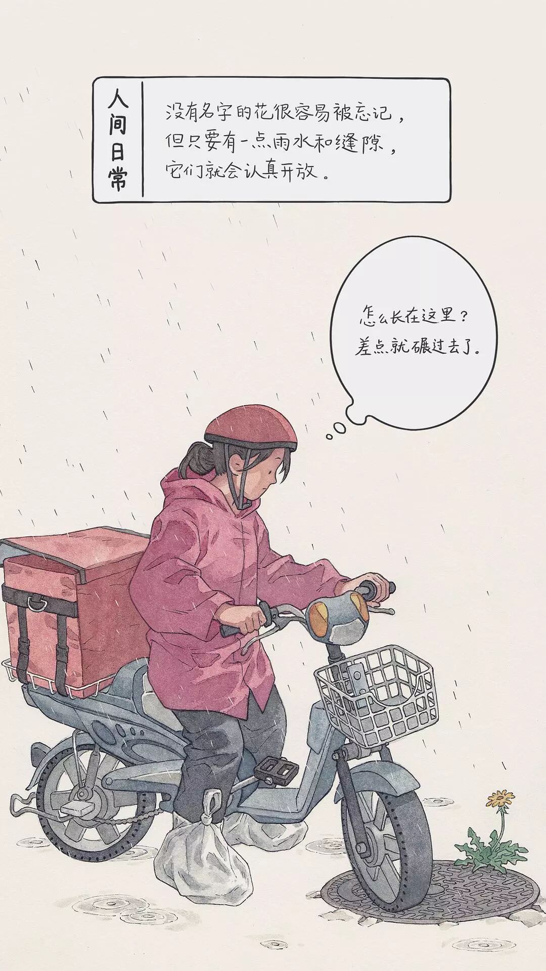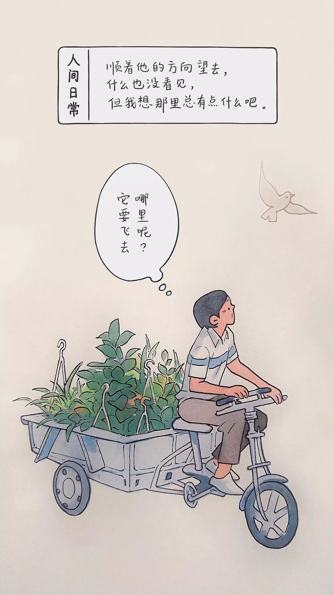 豆瓣用户@李彬BinLee 是一位插画师。有一天,他在过马路等红绿灯的时候,忽然留意到路边有一个蹬着三轮车卖花卉盆栽的中年男人。