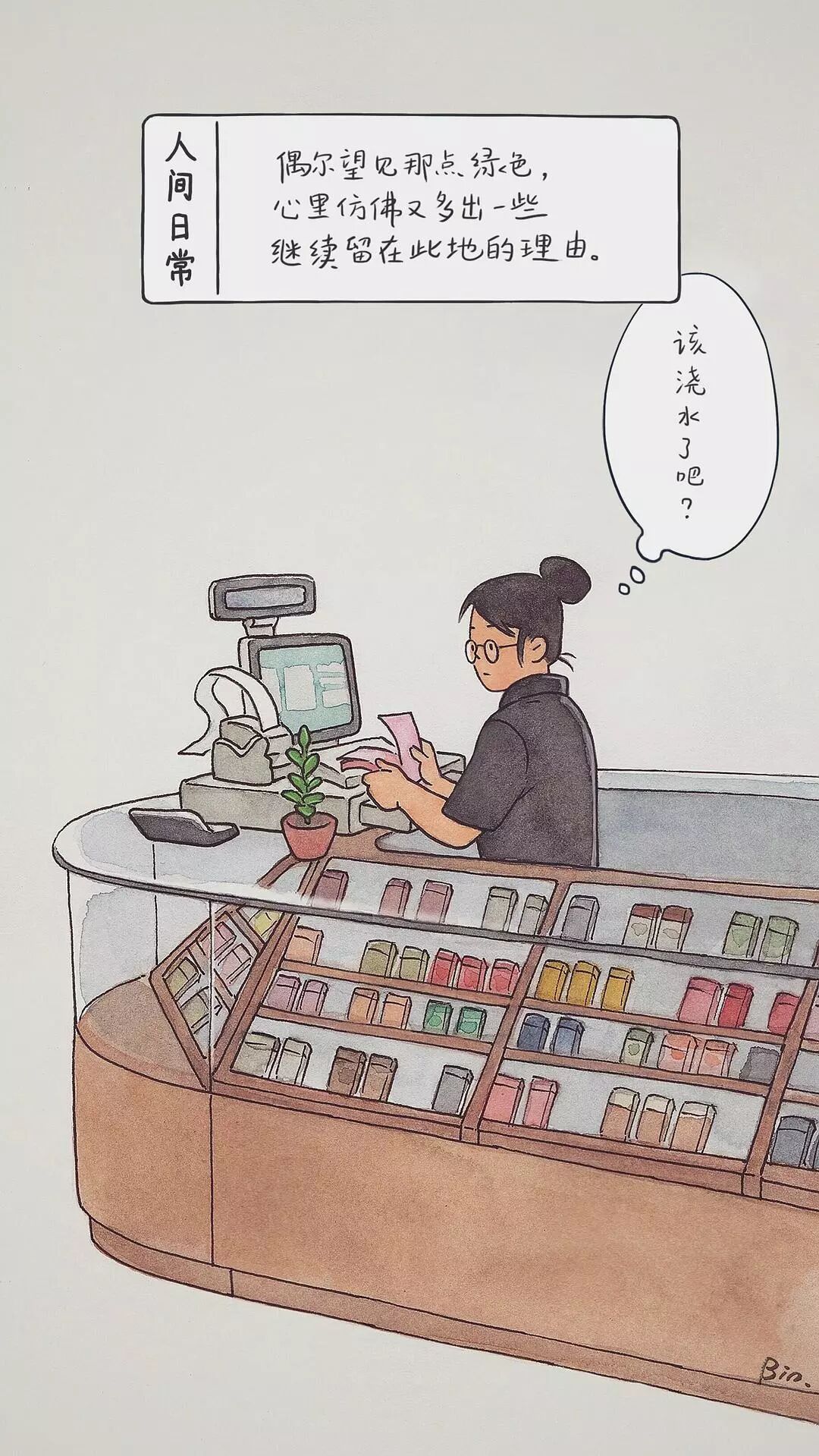 “他身边没有任何顾客,就那么呆呆地仰头望着天空出神。我也看着他发了好一会儿呆,想象他每天的营生,想着那么多花草要是卖不掉该怎么打理。直到红绿灯变灯,我便匆忙汇进人流走开了。回到家后他的身影还在我的脑子里盘旋不去,我索性提笔把他画了下来。”