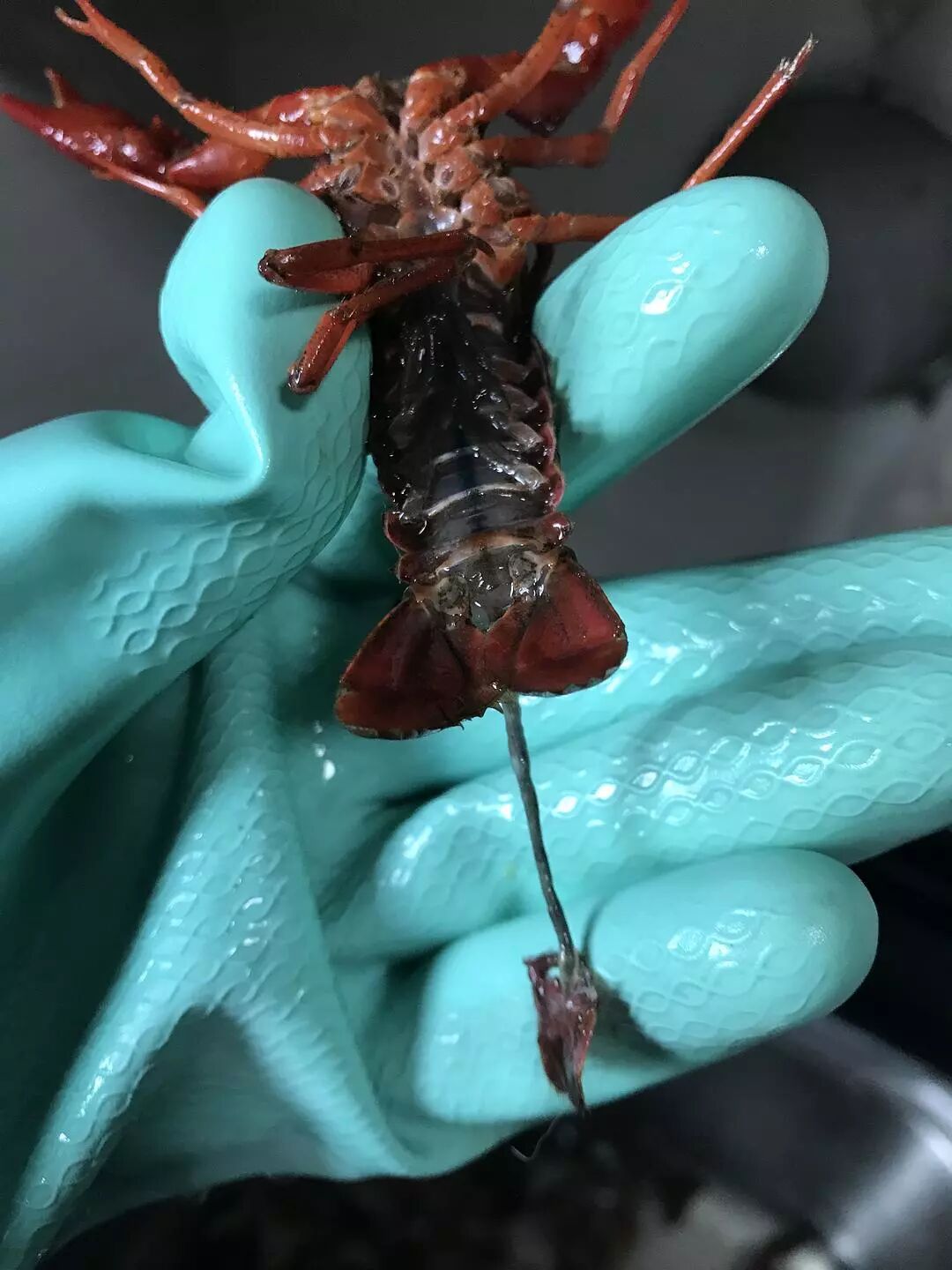 虾尾巴分三片,直接揪着中间那片往外扯,虾线就出来了……