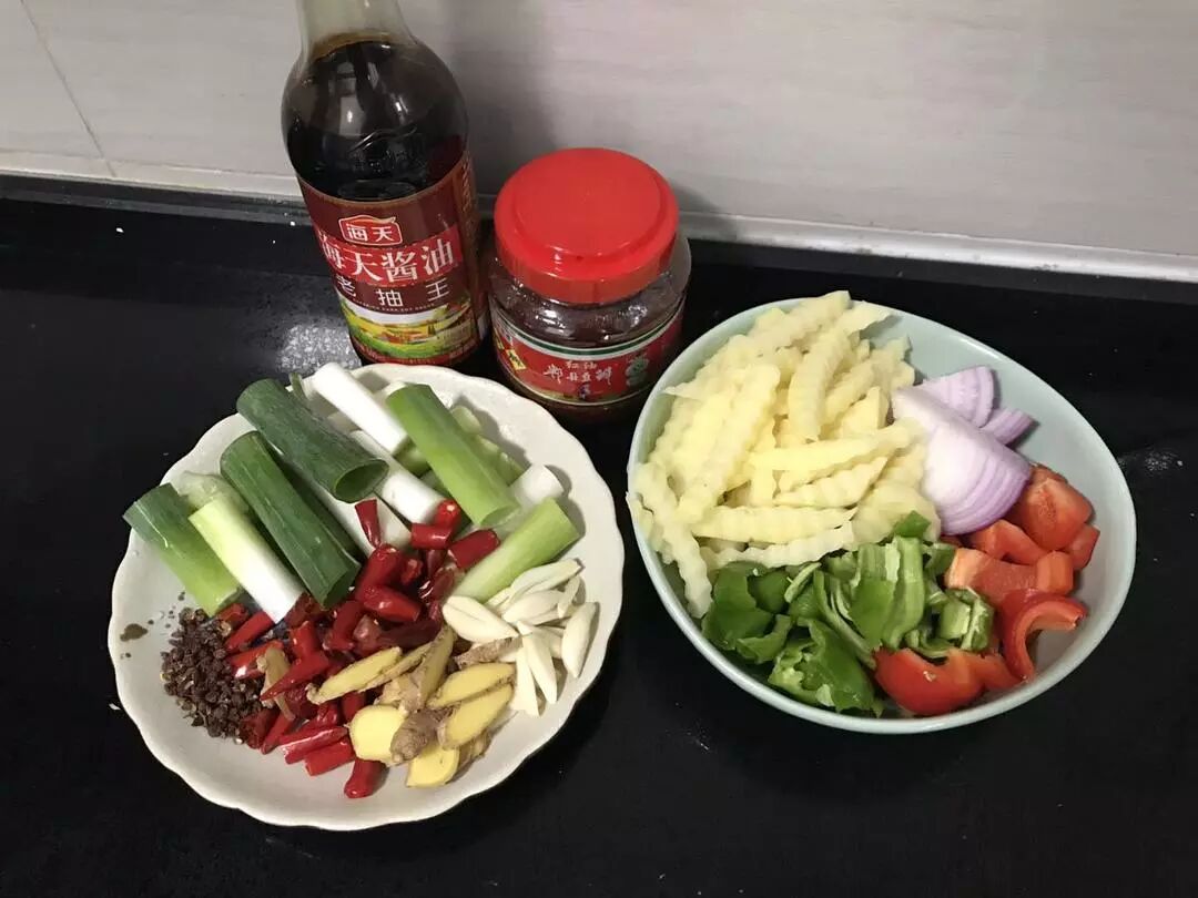 算了,不管了,爱盯就盯吧,准备调料和配菜先:大葱段、姜片、蒜片、干辣椒(我这是小米辣,不喜太辣的选普通干辣椒即可)、花椒、酱油、郫县豆瓣、啤酒一瓶,土豆、洋葱、青椒、甜椒。