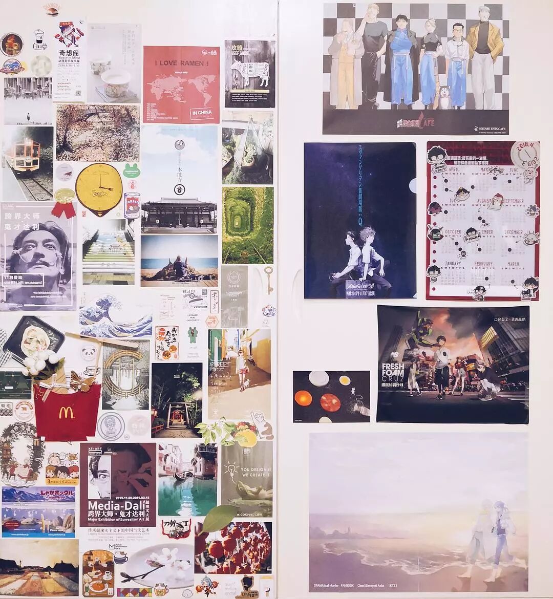 有泡面盖,商场展览海报,盒蛋壳,扭蛋说明书,门票,旅游手册,牛奶瓶盖,薯条盒,药包装,飞机行李票,饮料贴纸,饭店传单,各种糖果巧克力的包装,以及朋友送我的东西如果有能利用的就会剪下来贴XD