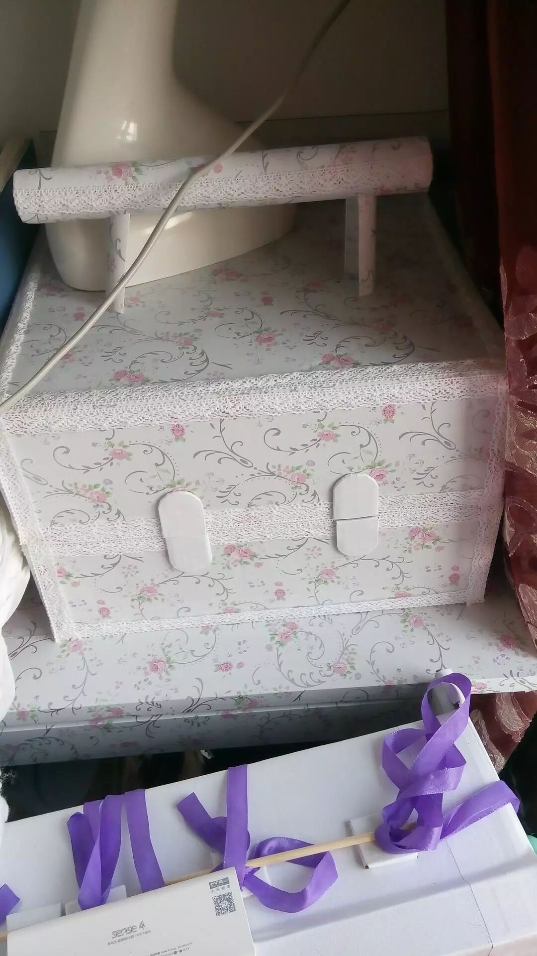 压力锅的箱子加上翻新贴纸和花边做的收纳箱和耳环架。