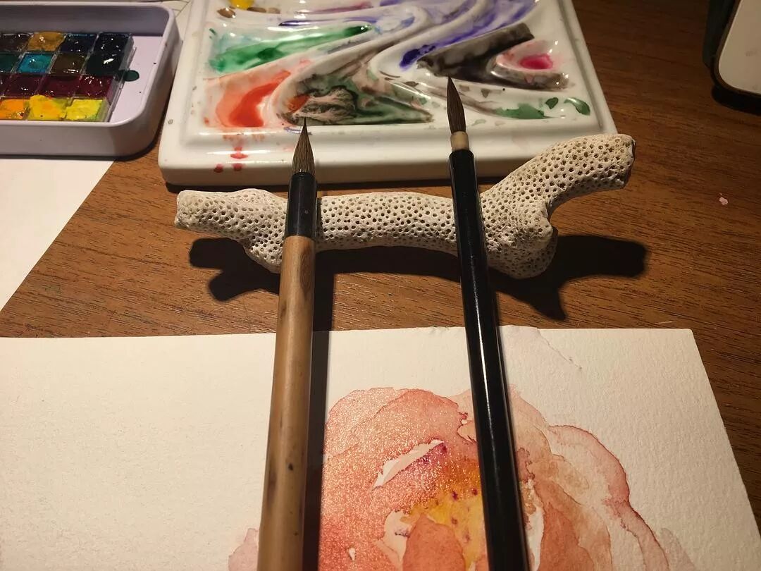 这个笔搁,其实是海边捡的珊瑚,放笔特稳。