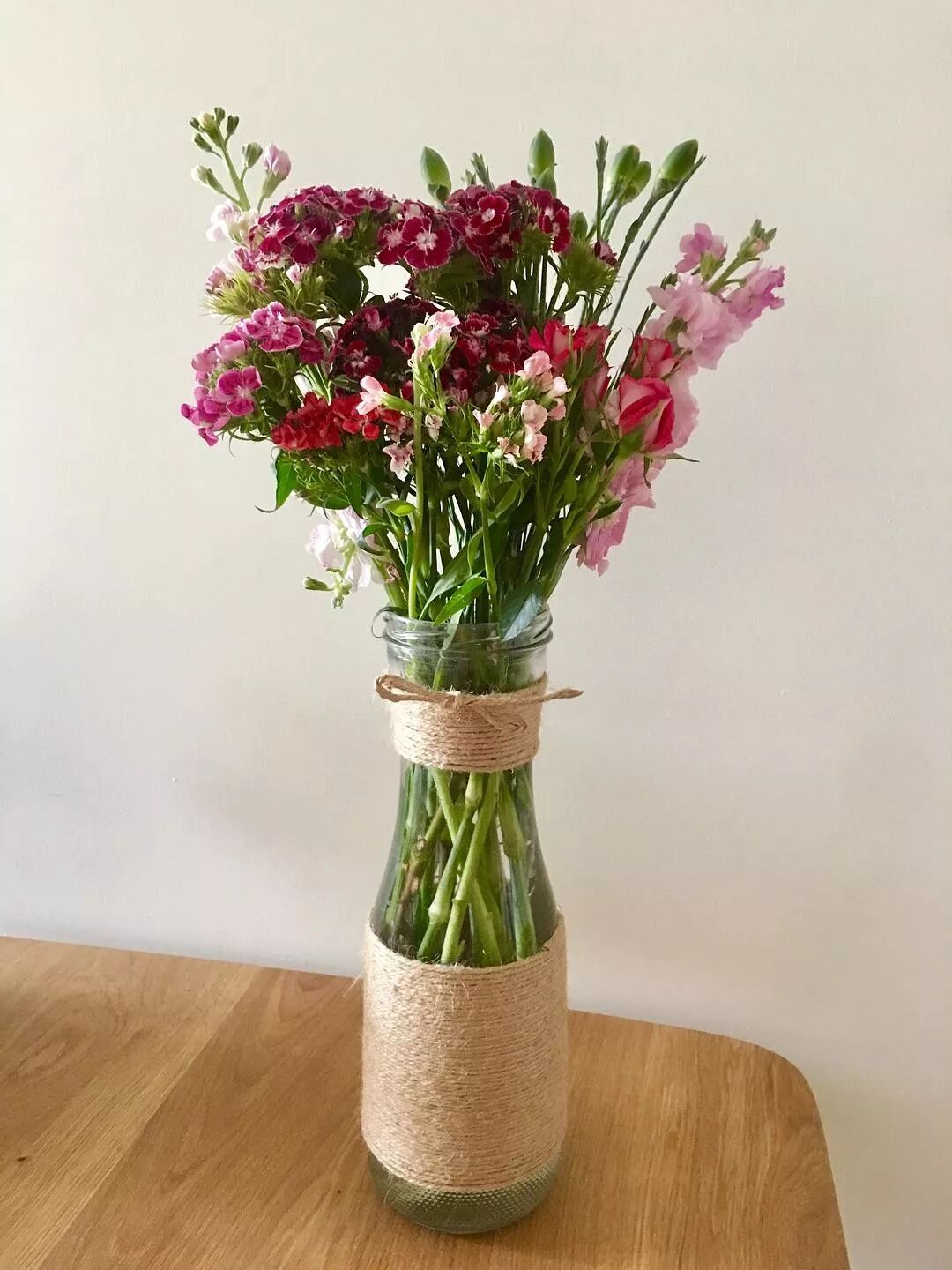 一个玻璃饮料瓶,当花瓶挺适合,没想到商标贴的死死的时候根本撕不下来,太难看了。麻绳拿出来缠一缠,立马小清新:)