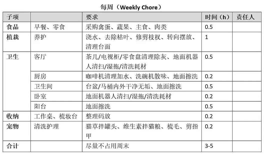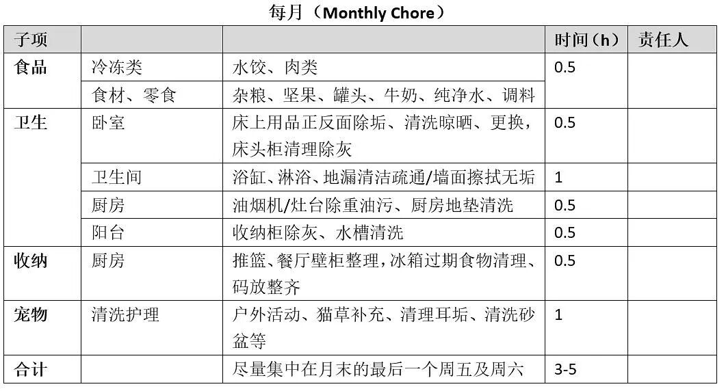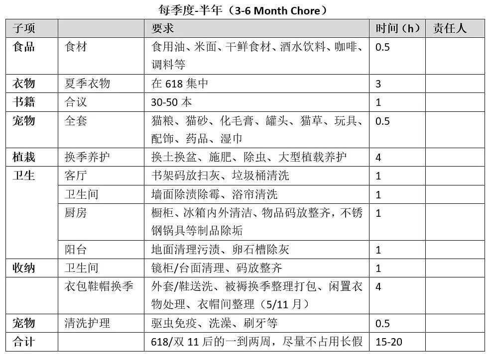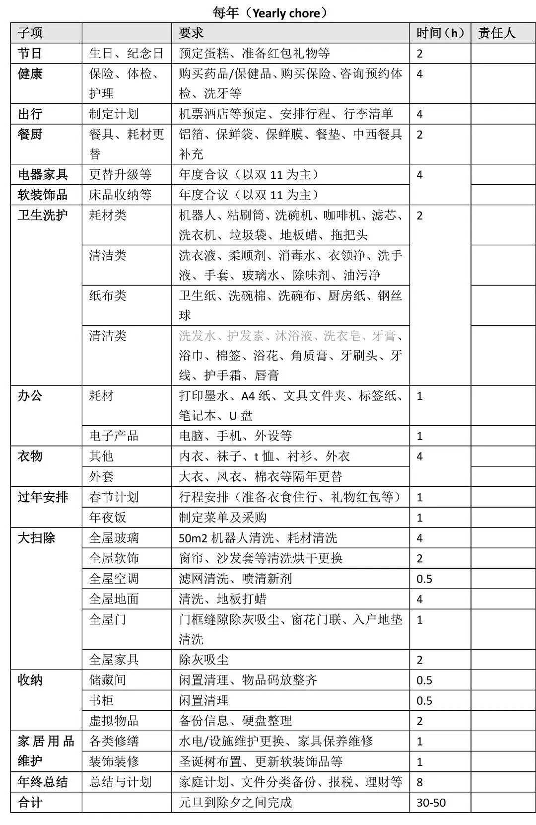 2. 集中时间办大事基本上只有半年表和年表要花费一定时间,日均合计都保持在2小时以内,也就是一人一个小时就差不多了。。毕竟没人把家务当乐趣干,平时安排太多事执行难度会很高。而且年度性扫除可以外包,上门一次全天服务比每周都来好管理得多。还有做一小时家务可以抵50千卡热量。。