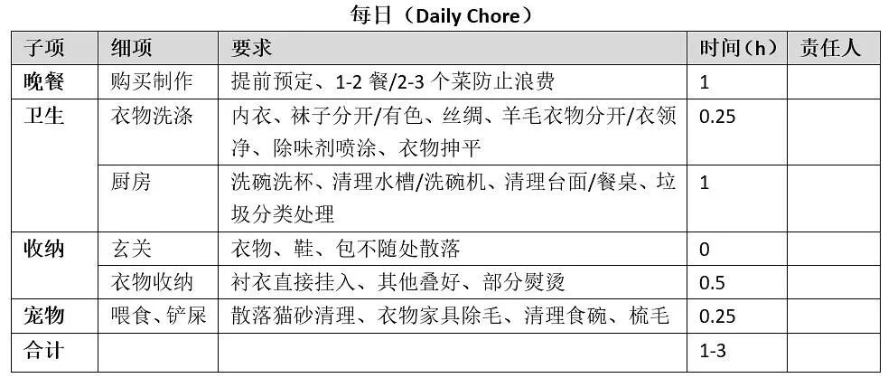 每日清单总共6项,如果不在家吃晚餐的话就只有4项,1个小时完成,人均半小时。