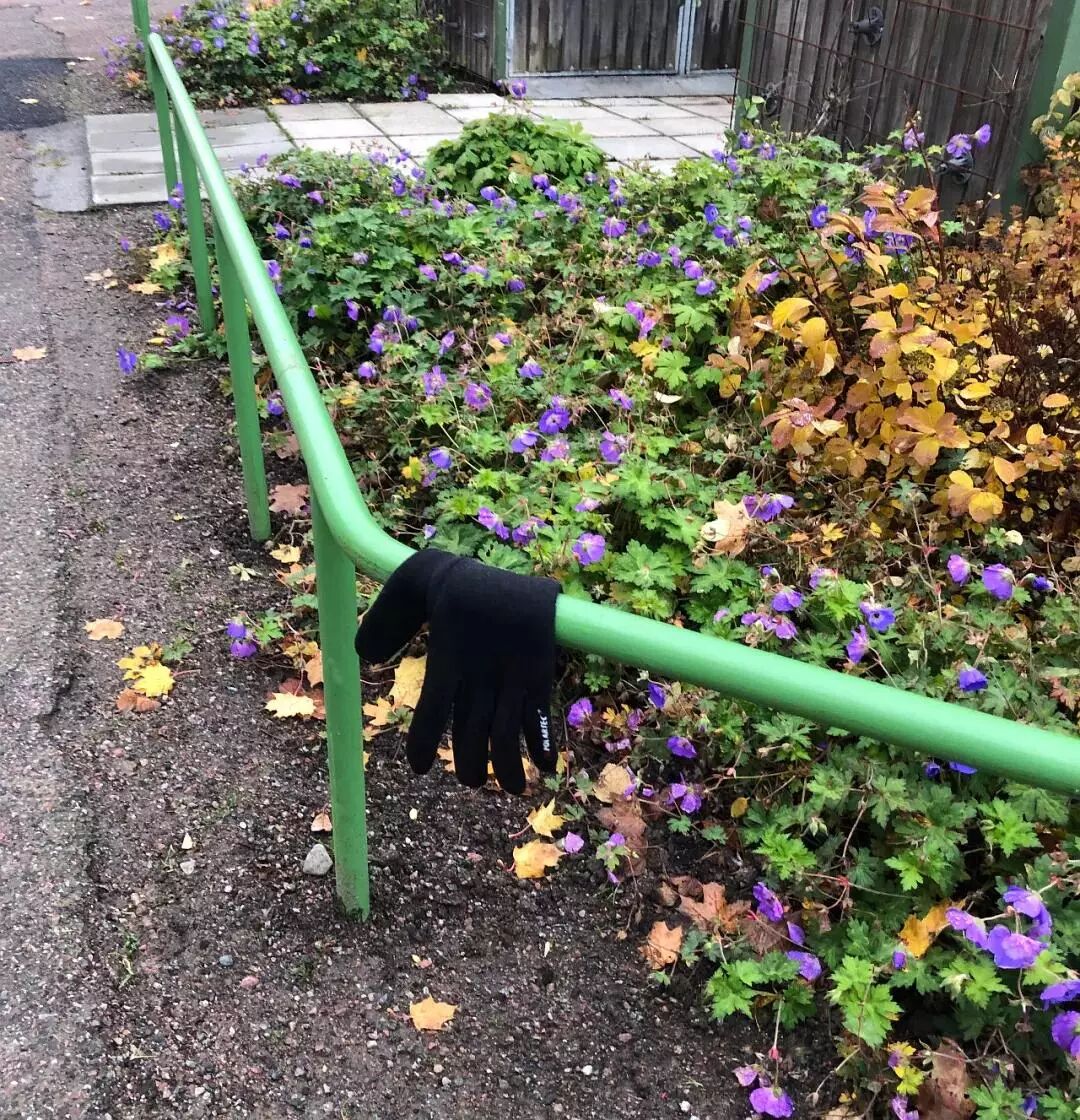 下面这只手套,我第一次见到它的时候它在花丛里,之后被挂在了围栏上,