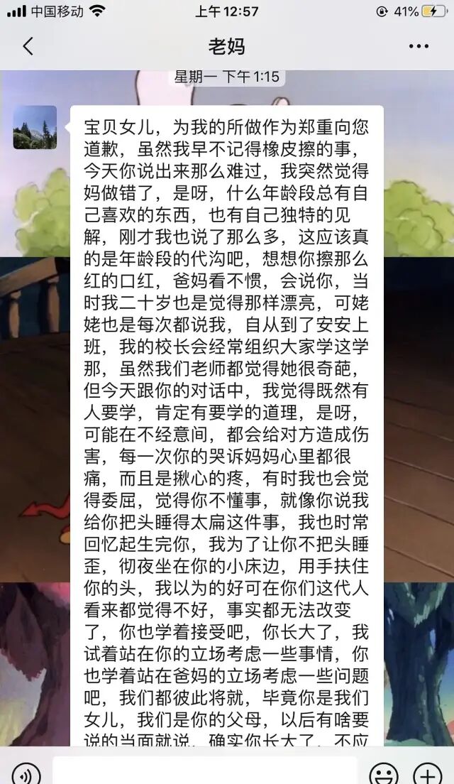 我是独女,爸妈把能给我的都给我了,说我是泡在蜜罐里长大也不为过。只是橡皮擦从八楼被丢出去的瞬间,对还在读小学的我,没有什么兴趣爱好的我来说冲击实在太大,记性不好的我记性又很好,我哭着求妈妈别把我的橡皮擦丢掉的画面,我好像一辈子也忘不掉。大家给我的回复我每条都很认真地看完了,感觉太多熟悉的母女相处的场景浮现在我眼前。有位豆友讲自己再也不会跟妈妈说把自己睡扁头了,还有豆友在我的评论里留下了想跟妈妈和解的期望。我流了很多眼泪,包括我自己发这条的时候也一直在哭。有的豆友可能以为我这么多年都在记恨我妈,其实没有。我记得小的时候被她骂的最惨的那次我也没有恨她,只是晚上躲在被窝里偷偷掉眼泪,拿着小刀狠狠划手腕,恨不得自己马上死掉。但很幸运那把小刀钝的连纸都划不开。这么多年的爱与包容早让我明白生在这样的家庭是我的幸运,只是我没想到妈妈多年以后可以就此向我道歉。我妈妈是自闭症老师,经常周六周天都要给孩子们上课。因为见过太多无法正常与人交流的“星星的孩子”,所以她对我的期望从出人头地转为平安健康。“我以为的好在你们这代人的眼里都不算好” 唉 哭了 爱好难哦 妈妈真好老爸那句突然笑出来哈哈哈哈哈哈哈以为你在欺负妈妈😂真的是很温柔的妈妈呀,给我看哭了。就像妈妈以为橡皮只是小事,但我们可能会突然很受伤而记很久,也还会有很多我们无意识的抱怨被妈妈听到并且非常在意,她们也会难受很久。我也对我妈吐槽过把我头睡扁这件事,看了楼主妈妈的消息我决定以后不再提这件事了,我只是偶尔吐槽,并不是想怪她,不要给她负担了妈妈太温柔了 我妈只会说我怎么那么爱记仇 难道那块橡皮的钱不是她给我的。来自拥有pua母亲的羡慕你妈妈是个好妈妈,我如果跟我妈哭诉我妈会说你怎么还记得。不是说我妈不好,我妈对我很好,他是个很好很好的妈妈。但是一个父母能够像子女向那么多年前的事情郑重地致歉,已经超越了优秀的父母,而是珍贵的父母。唉 你妈妈好好呀 都让我想到我妈妈了 我妈每次给我写这种长文的时候开头也都是宝贝女儿 小乖乖之类的 唉都是好妈妈👩🏻很好的妈妈 其实我们第一次给人当儿子当闺女他们也是第一次当爹当妈 大家都是新手 互相理解真好高二搬新家,我爸妈对装修不在意,觉得能住就行,装修有我哥哥姐姐全权代理,知道我人微言轻,其他没要求只想要一个方便学习的书桌和台灯,结果也没买我想要的,买了哥哥姐姐想要的。我年年想起来都会彻夜睡不着,以至于现在我打工有工资,只爱买台灯,淘宝收藏夹都是台灯。后来我妈给我道歉,希望我不要再想不开什么的。但我真的是受伤了好多年,感觉像1988的德善,一直不受重视。我觉得我超级能够理解。这个假期我和妈妈吵了很多很多。把我以前很多年的委屈都说出来。真的像你说的那样,孩子的记性不好,有时候又很好。说出来了之后感觉会好很多。我妈虽然爱面子绝不可能给我写信道歉,但是她一般都会给我做爱吃的菜还有带我逛街来补偿我。挺好的 至少你的哭诉是有回音的 而不是自己的委屈只有自己懂其实我还挺想说一句的 父母对孩子有什么冒犯 孩子真的记得好清楚啊而且很难原谅……相反孩子伤父母很深 只要好好哄哄父母 父母一定会原谅的……发现很多次这个道理了,还是好好爱父母吧,他们比你想象的还要爱你。让我想起了我的妈妈,她是这个世界上最理解我,并且小心翼翼保护着我的敏感自卑的最爱我的人。我小时候说出让她很伤心的话,她也没有凶我,我现在甚至以为是让她太伤心,失望透彻到不想凶我,但其实她后面再提起的时候也只是说是很伤心,但是还是很爱我,一如既往。她明明从出生到彻底离开这个世界,都没有享受过什么温柔,却以最强大最温柔的母爱包容我到16岁,好为她伤心。扁头这个,我妈也是,我跟她抱怨了现在嫌弃之后,她就很后悔说可是那时候都觉得扁头洋气好看才给我枕的,谁知道现在又不流行了呢……我妈也给我发过比较短的道歉信,因为把我的两瓶美胸霜扔了 0.0说让我当晚可以大声打游戏,她不会管我,作为对她的惩罚&……?我们大多数人都不是大富大贵的出身,世界上也没有完全完美的父母。但你能有这样的妈妈真的是个幸福的孩子。人生很长的,以后也会遇到很多事。有这样的妈妈在,就有勇气面对很多事。你妈妈有你在,也会有力量面对生活的种种。