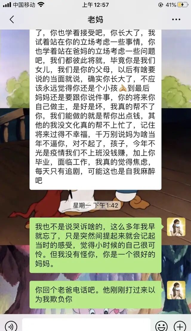 我小学五年级给同桌抄考卷,写完了露出来给他抄,一次一块钱,我就用这个一块钱去买两盒奥特曼形状的橡皮擦。因为太喜欢这个橡皮擦,我考试的时候先写完了就看同桌笔盒上的摆着的橡皮擦,结果被当时的班主任痛骂一顿以为我在抄他的考卷。我讲到被老师骂的时候越说越没有底气,在餐桌上直接爆哭,我妈一个从不流露自己情绪的女人也开始跟我一起哭。我实在吃不下饭就回房间了,留我妈一个人在客厅,过了一会儿我妈给我发消息了。