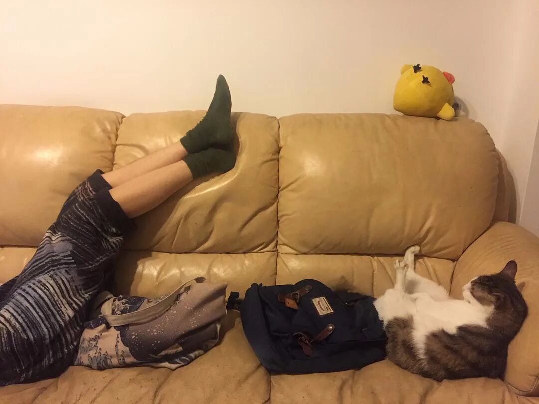 有一天在客厅里突然看到这一幕...惊呆了... (照片中的我室友当时是在很不经意玩手机,没有任何摆拍) 来自豆瓣话题#你和你家宠物的同步瞬间#