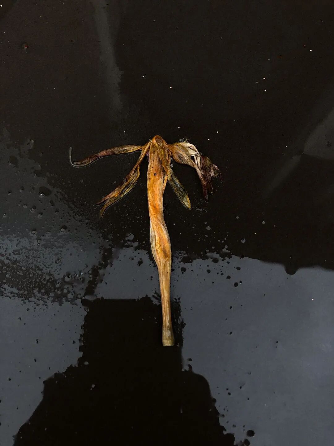 枯萎的萱草花匍匐在地上,像一只在舞蹈时被风干的蜻蜓