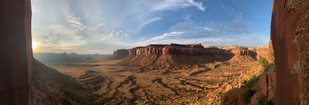 562. 上周四是我们在Indian Creek的“休息日”,按计划我们先去参观拱门国家公园,等下午晚些时候天气不那么热了,再回Indian Creek找面背阴的墙爬一会儿。当我们到了岩壁底下已是五六点钟,想爬的高质量线路Excuse Station前面还有两组人在排队,我们只好排队等候,顺便爬爬旁边的一条线。这时太阳逐渐西沉,残阳把金黄色的光辉洒向对面的一片岩壁,我的同伴就在我们的岩壁底下拍下了这样一张绝美的照片。