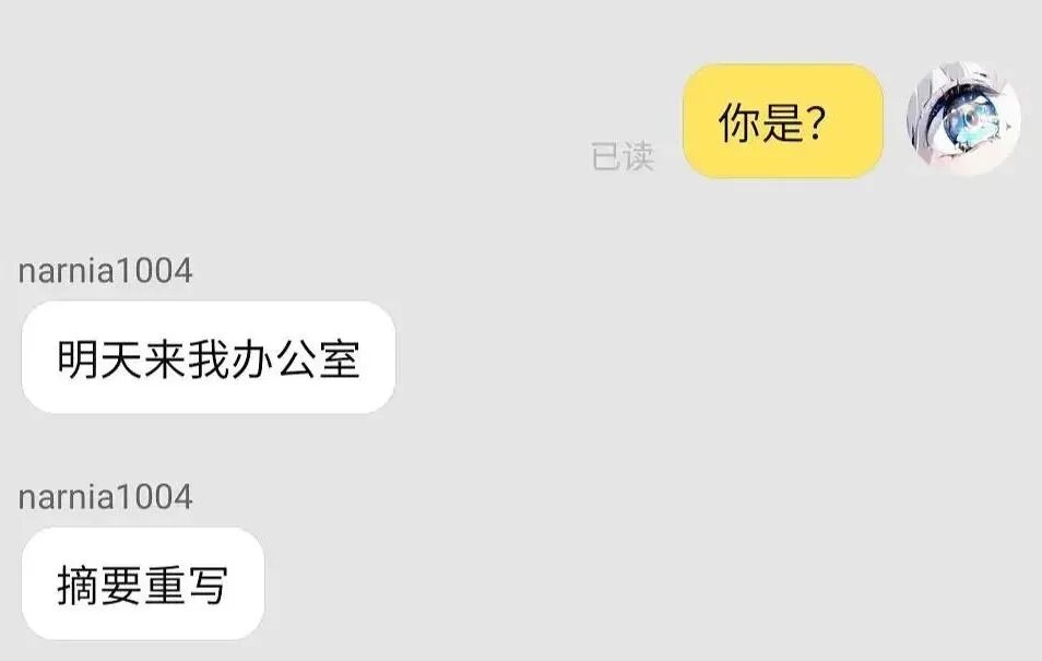 我真的给跪了,我都怀疑老师这是挂了个店铺在默默监督我们谁来偷偷找别人改文章。我的心情仍然无法平复,想到明早,我坐在老师办公室里写摘要就无比的酸爽。现在我希望我永远没问第二个在么。。