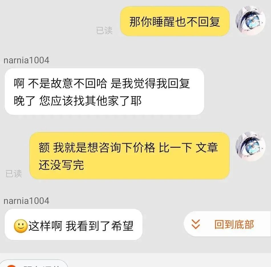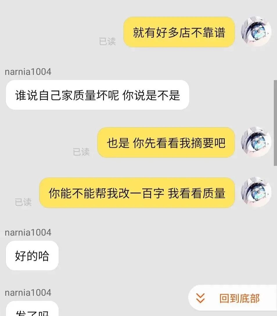 事情是这样的,我们组导师人称炸药包,就看你哪里写的不符合他的预期,他就会爆炸。那种炸了骂人一顿,然后就很快当做什么都没发生,又给你讲解的那种。但他每次骂起来,我都会比较怀疑人生。为了叫大家都好过,我就想在文章拿给他看以前,自己先找个专业点的人偷偷改一遍。但是国外机构贵的我买不起,差评多的店我又不敢买,找来找去,我就想到,那种老板就是干活人本人的店也许更靠谱。就是觉得店家有点弱智呆萌,感觉也不是很熟练客服话术,不管了只要足够专业就可以。他说出了我的方向 也就算了。我觉得是很正常的。毕竟如果他要给人改文章,扫一眼也知道方向了。还有比他更博学的客服吗?哈?
