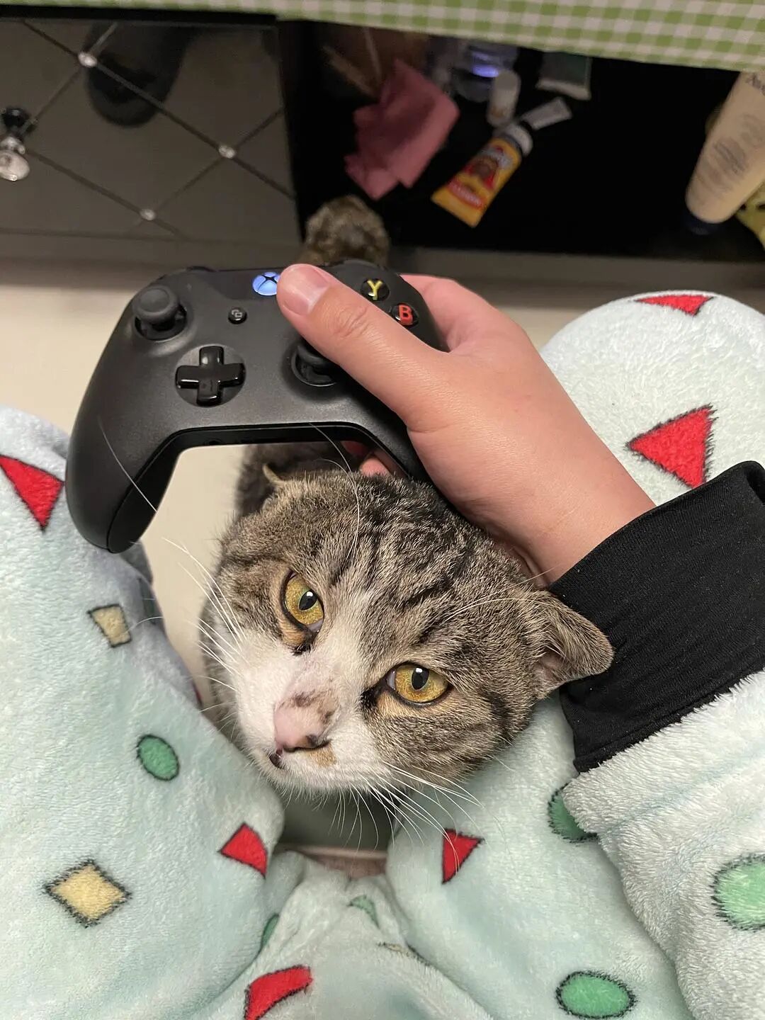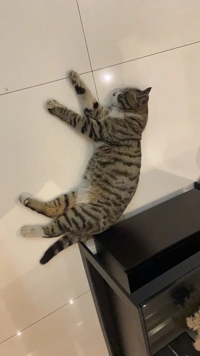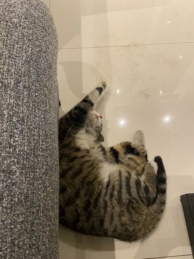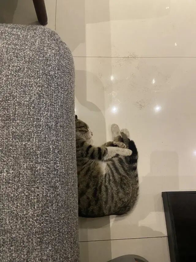 事情是这样的,吃完晚饭停好车在小区里溜溜达达准备回家,路上老公去上了个厕所,我找了个长凳坐,当事猫出现。我啧啧了两下,该猫在我腿边蹭了蹭便跳上长凳,三下五除二开始在我怀里踩奶,然后蹬鼻子上脸前爪搭在我肩膀上,边呼噜边踩 。。。踩了一会就这样踹手闭眼睡觉了。。。我全程一脸问号 。。。嘀嘀咕咕了一会我俩决定随缘看它愿不愿意跟我们回家。把该猫放在地上后,我们就开始走,边走边啧啧。该猫一会前一会后,随行到楼门口,然后顺利坐上电梯跟回家了。。。本来还担心它怕生,谁曾想,进屋左看右看,连沙发底下也没藏一下(跟我想得不一样啊!),不到三分钟,就呈现下图姿态。![]()