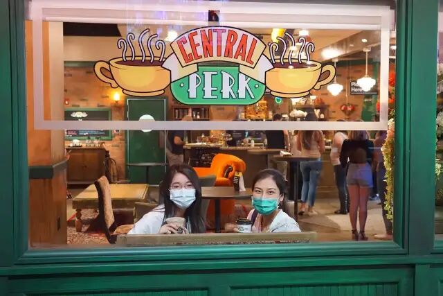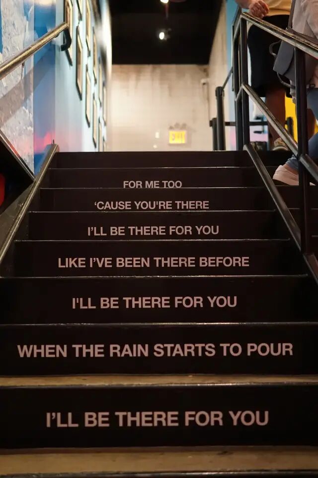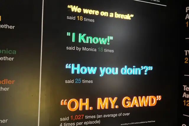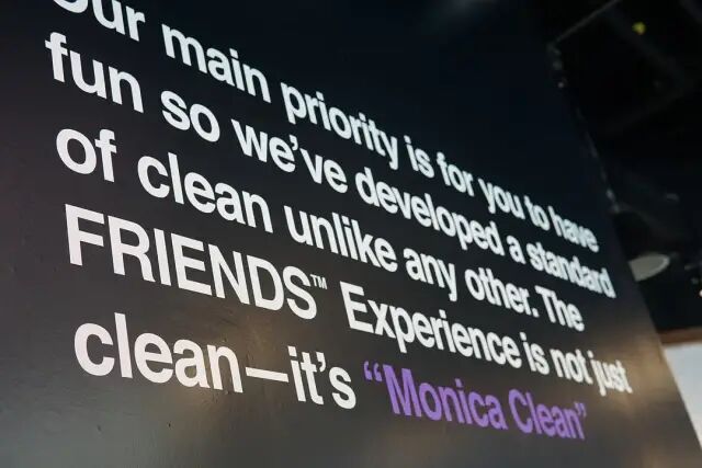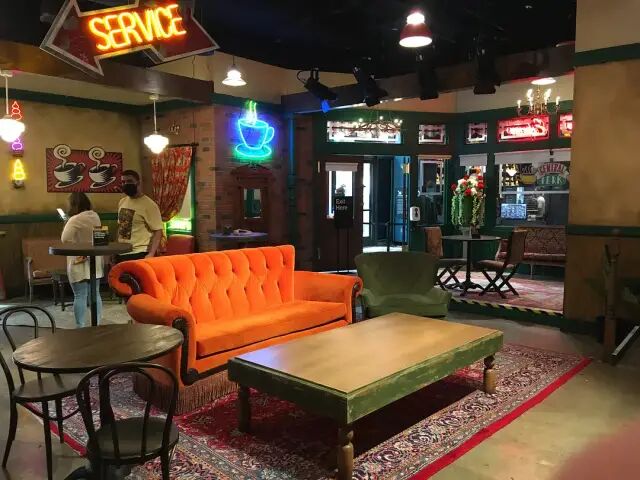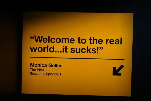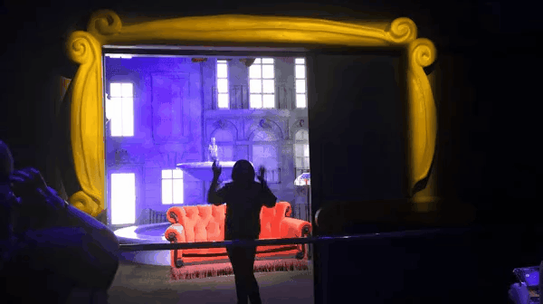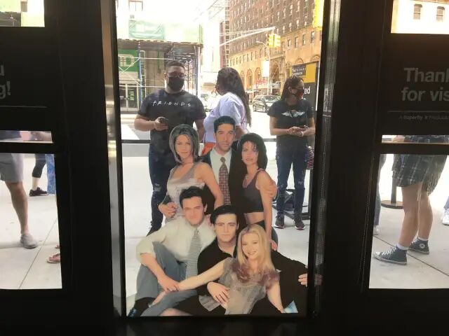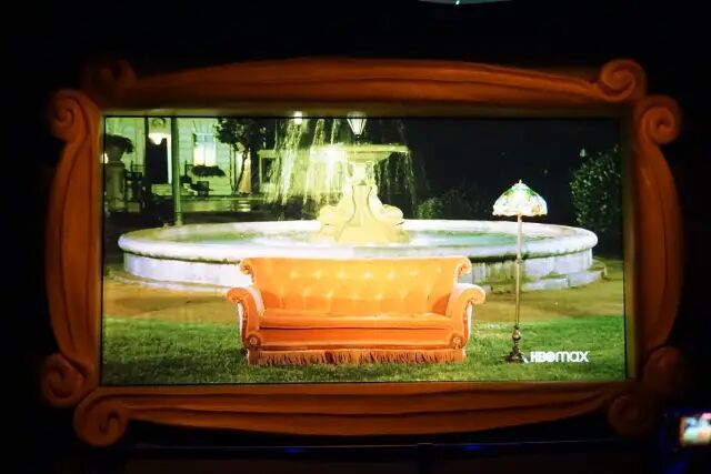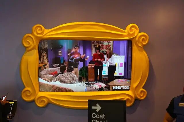 门票需要提前在网上购买和预约时间,门外排队的人并不多,老友记的主题T恤在很多商店和网站都有卖,好多粉丝都是“盛装”有备而来的说实话……我觉得这个快闪店标题的logo挺丑的……⬇️进门之后的等待区,墙上的电视循环播放着一些著名片段,HBO Max的标志尤其显眼。2020年Netflix不再播放Friends之后,五月份才在HBO Max重新上线,天知道那五个月美国人经历了怎样没有Friends陪伴的COVID岁月。(P.S.十分感谢HBO Max促成了历史性的friends reunion!)![]()