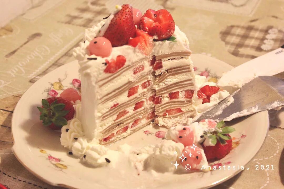 。蛋糕雪崩的时候没有一颗草莓是无辜的T^T 今天的草莓千层,装饰堆的太满, 结果从背面雪崩了 最上面一颗草莓捡回来小花也跌没了 千层面糊里加了草莓果酱, 煎出来特别香甜,边做边吃哈哈哈 还是一半mascarpone一半淡奶油,打的很软比较不腻, 粉色的是加了草莓粉的小年糕, 安慰自己好吃就行了 来自豆瓣话题#我的烘焙笔记#