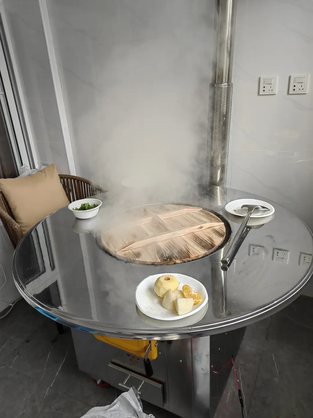 我家是个小院子,屋子上面开个小圆口,把烟囱探出去。