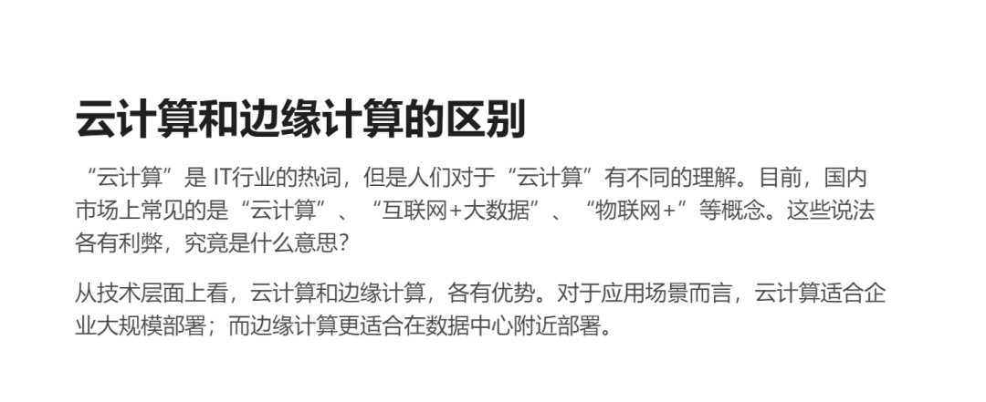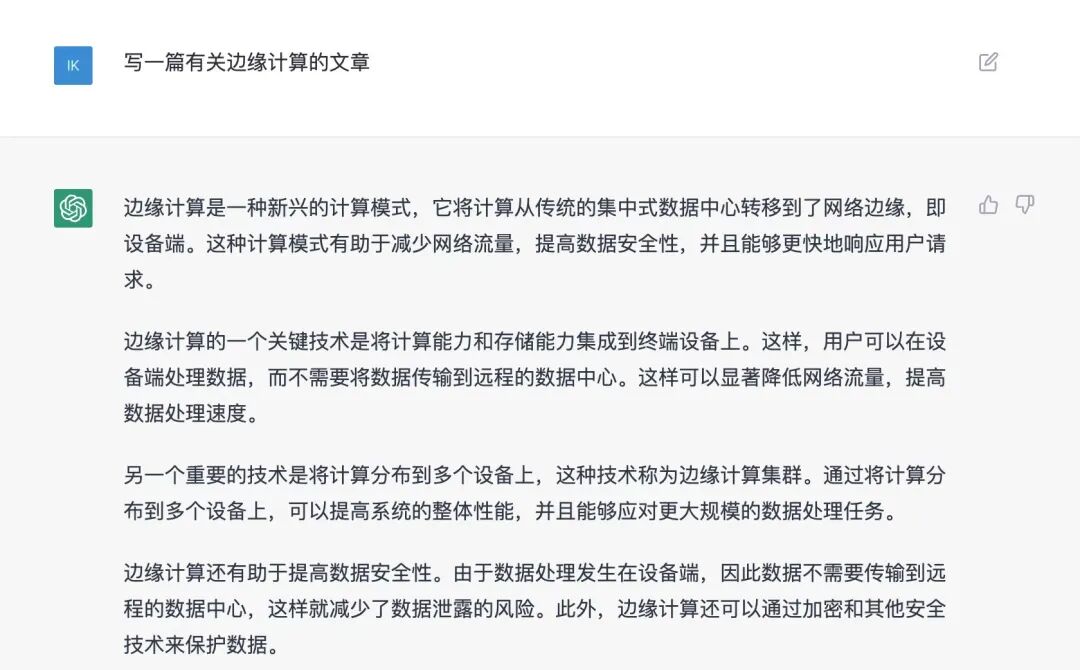 边缘计算是一种新兴的计算模式,它将计算从传统的集中式数据中心转移到了网络边缘,即设备端。这种计算模式有助于减少网络流量,提高数据安全性,并且能够更快地响应用户请求。边缘计算的一个关键技术是将计算能力和存储能力集成到终端设备上。这样,用户可以在设备端处理数据,而不需要将数据传输到远程的数据中心。这样可以显著降低网络流量,提高数据处理速度。另一个重要的技术是将计算分布到多个设备上,这种技术称为边缘计算集群。通过将计算分布到多个设备上,可以提高系统的整体性能,并且能够应对更大规模的数据处理任务。边缘计算还有助于提高数据安全性。由于数据处理发生在设备端,因此数据不需要传输到远程的数据中心,这样就减少了数据泄露的风险。此外,边缘计算还可以通过加密和其他安全技术来保护数据。边缘计算和云计算都是新兴的计算模式,它们都有助于提高系统的性能和效率。但是,它们之间也有一定的区别。边缘计算是将计算和存储等功能放置在网络边缘,也就是在数据产生的地方进行处理,以此来提高系统的实时性和可靠性。相反,云计算则是将计算和存储等功能放在云端,通过互联网进行访问,以此来提高系统的可扩展性和灵活性。因此,边缘计算和云计算在某些方面可能会有重合,但也存在一定的区别。在实际应用中,边缘计算和云计算可以相互配合,共同为用户提供更优质的服务。WOW!这个输出结果就让人有些惊讶了。作为对比,我们可以看一下同样的命题用传统的AI写作软件生成的结果:可以看出,下方的生成结果明显有点儿文不对题,回答的重心倾向于解释云计算的概念,而且出现了类似“这些说法各有利弊,究竟是什么意思?”这种莫名其妙的转折句。