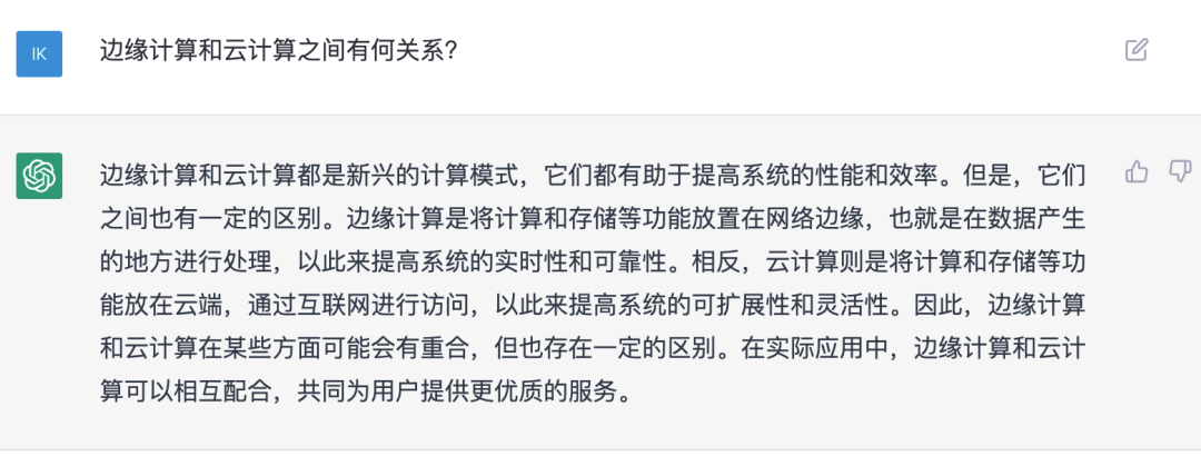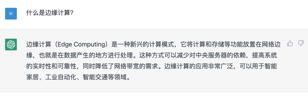 AIoT(Artificial Intelligence of Things)是指将人工智能技术与物联网技术相结合,使物联网设备具备人工智能能力的技术。通俗地说,AIoT 是指将人工智能技术应用于物联网领域,使物联网设备更智能、更聪明。AIoT 技术的应用可以使物联网设备能够更好地实现信息处理、决策制定和数据分析等功能,为用户提供更优质、更便捷的服务。边缘计算(Edge Computing)是一种新兴的计算模式,它将计算和存储等功能放置在网络边缘,也就是在数据产生的地方进行处理。这种方式可以减少对中央服务器的依赖,提高系统的实时性和可靠性,同时降低了网络带宽的需求。边缘计算的应用非常广泛,可以用于智能家居、工业自动化、智能交通等领域。从以上结果我们能看出,涉及专业概念的东西ChatGPT回答的都比较简洁和准确,直接拿来放在稿件甚至报告里用都没有什么问题。但是,这并没有什么大不了的,毕竟——查概念谁不会上维基百科啊?