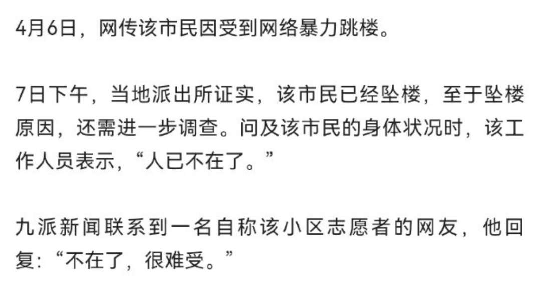 哥在昨天的新闻里提到,上海一女生给跑腿小哥打赏200元被网暴的事儿,当时就有网友传当事人跳楼自杀了。