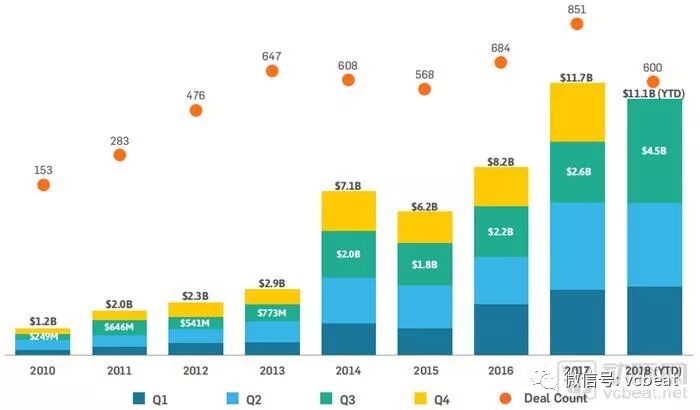 2010-2018年全球投融资交易额、交易量