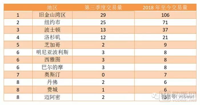 第三季度中,纽约市完成了25笔交易,投融资额近16亿美元,超过了包括旧金山湾区(8.65亿美元,29笔交易)在内的其他地区。超过50%的交易量和交易额都流向了“三巨头”:旧金山湾区、波士顿和纽约市。