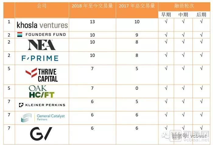 Kleiner Perkins和GV本季度首次出现在最活跃的投资者名单上,仅在第三季度就有五笔投资。F-Prime的排名从第六位跃升至第二位。截至2018年第三季度,上榜的投资者已经完成或超过了去年的总交易量。