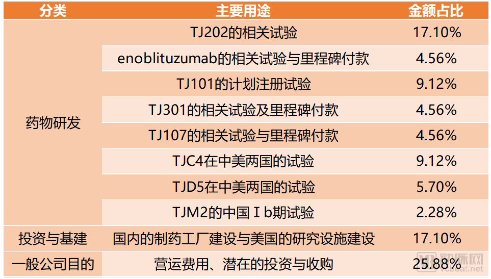 天境生物本次上市募集的资金,将有57%用于其药物管线的临床试验开支。另外17.1%的金额将用于研究设施和生产设施的建设,为未来的发展做好准备。剩余资金将用于其他的一般公司目的,主要是营运费用,以及未来可能发生的投资和收购。