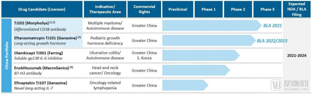 在此之后天境生物又先后收购了另外四款产品的大中华区权益。其中2017年12月获得授权的TJ202/MOR202(CD38)更是已经成为了天境生物研发管线中的核心产品,或将成为天境生物的第一款上市产品。