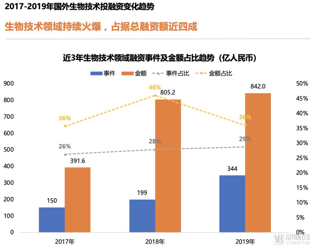 生物技术成为国外2019医疗健康投融资最热门领域,融资总额高达124.65亿美元(约842.7亿人民币),占总融资额比例约36%。